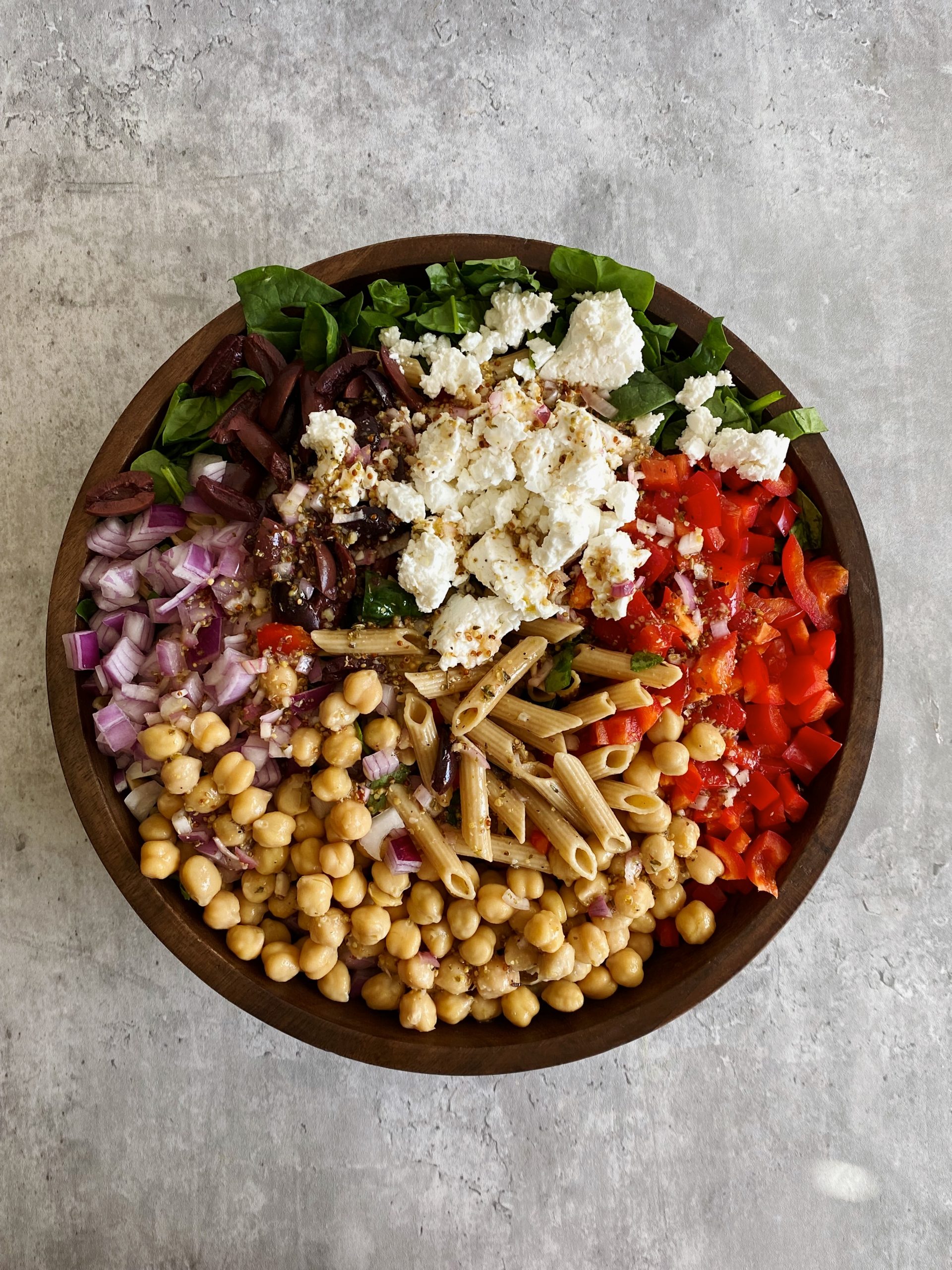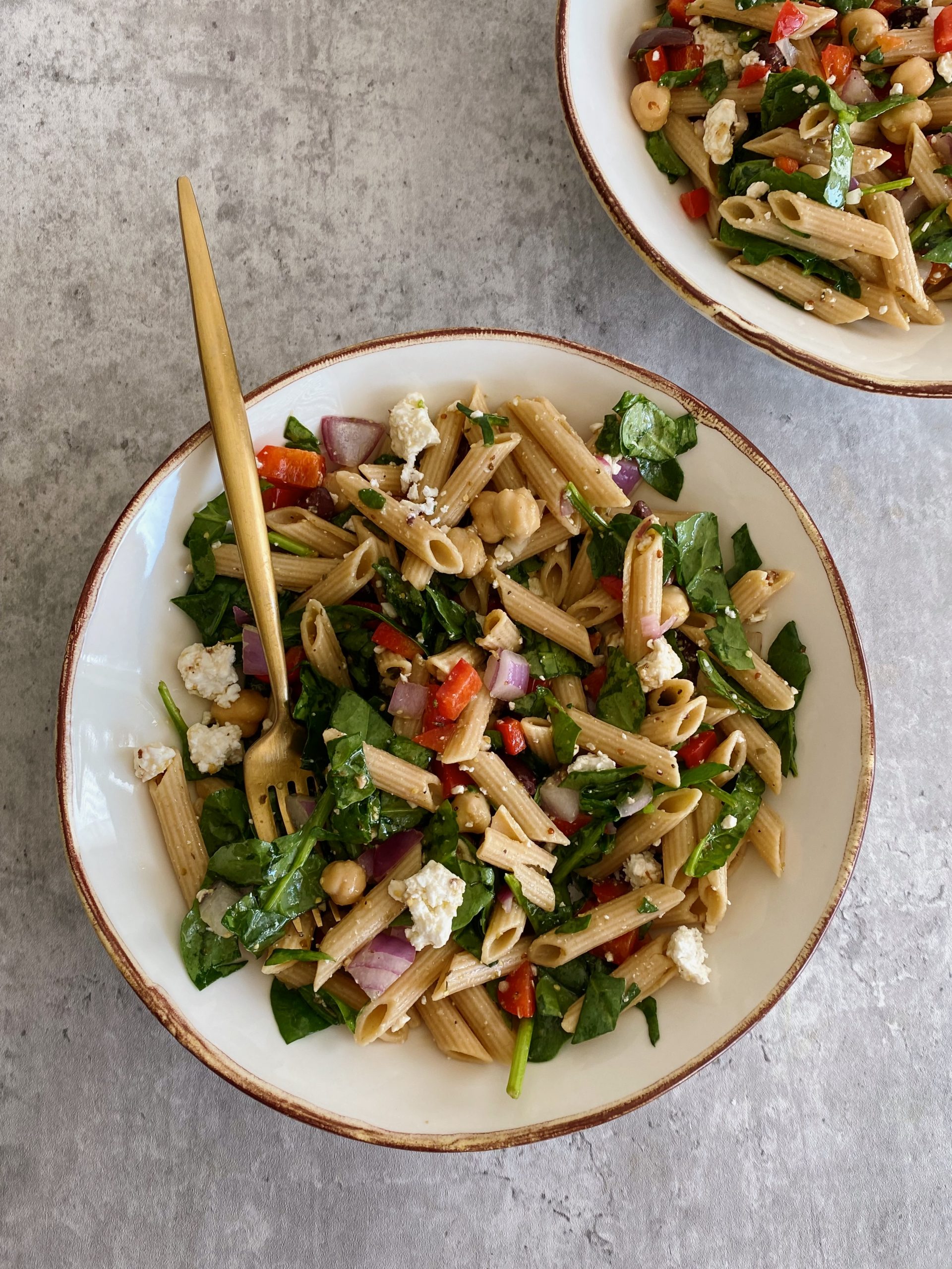 You can load up your pasta salad with pretty much anything you have on hand! I went for a Mediterranean spin with this recipe, and love the flavors it provided.
