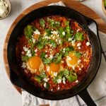- Once the eggs are cooked, remove the pan from the fire and top with fresh cilantro and a sprinkle of feta cheese.