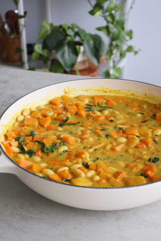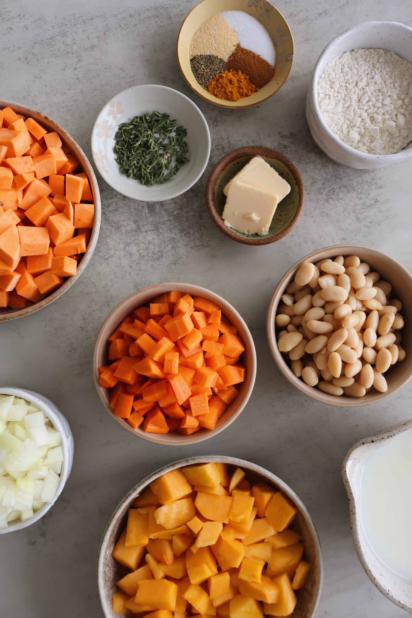 The filling is made with cubed sweet potatoes, carrots, butternut squash and white beans that are tossed in a spice blend of cinnamon, turmeric, salt & pepper. It get’s topped with a rolled out sheet of puff pastry for a crisp topping that adds the perfect texture.