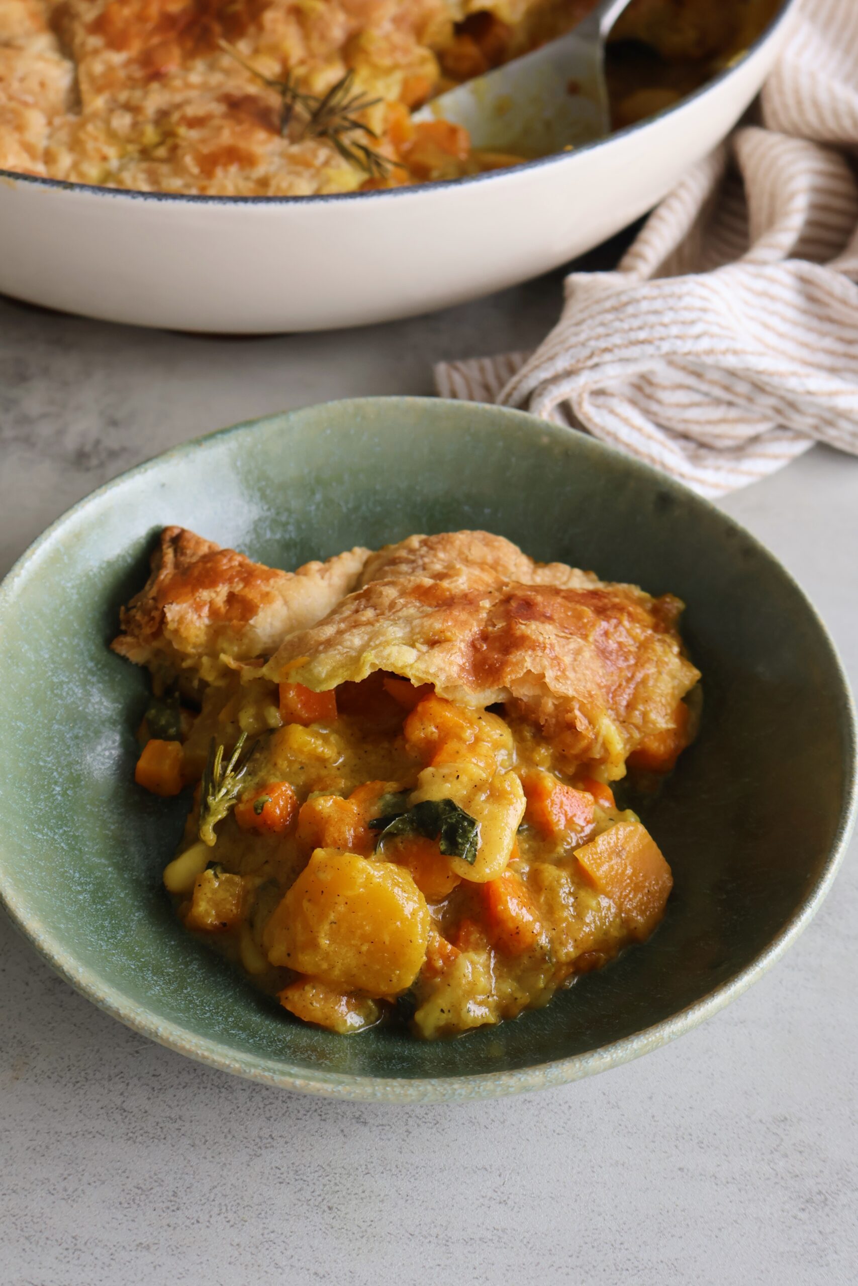 Traditionally, pot pie is made with a layer of pie crust as a topping and filled with shredded chicken or beef. I kept this version vegetarian, with the puff pastry twist as a topping. You can make this dish fully vegan by using plant-based milk and butter, or add shredded chicken for even more protein.