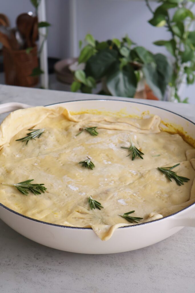 Roll on the puff pastry so that it’s large enough to fit over the filling. Cover the veggies fully, overlapping the edges if needed. I like to add a few sprigs of fresh rosemary onto the pastry before brushing with whisked egg