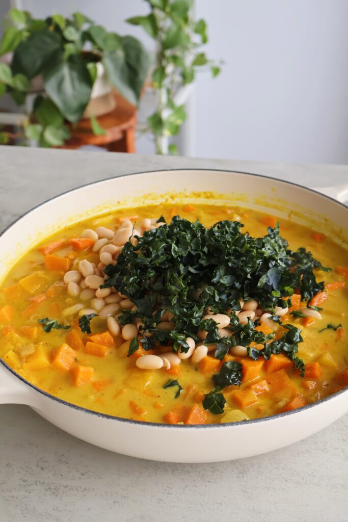 Toss in the canned white beans and shredded kale. Taste and adjust salt as needed.