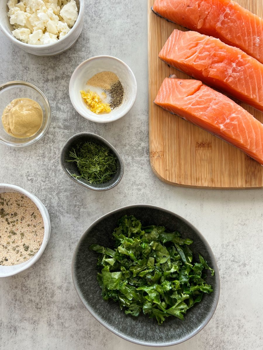 Ingredients you’ll need for feta stuffed salmon