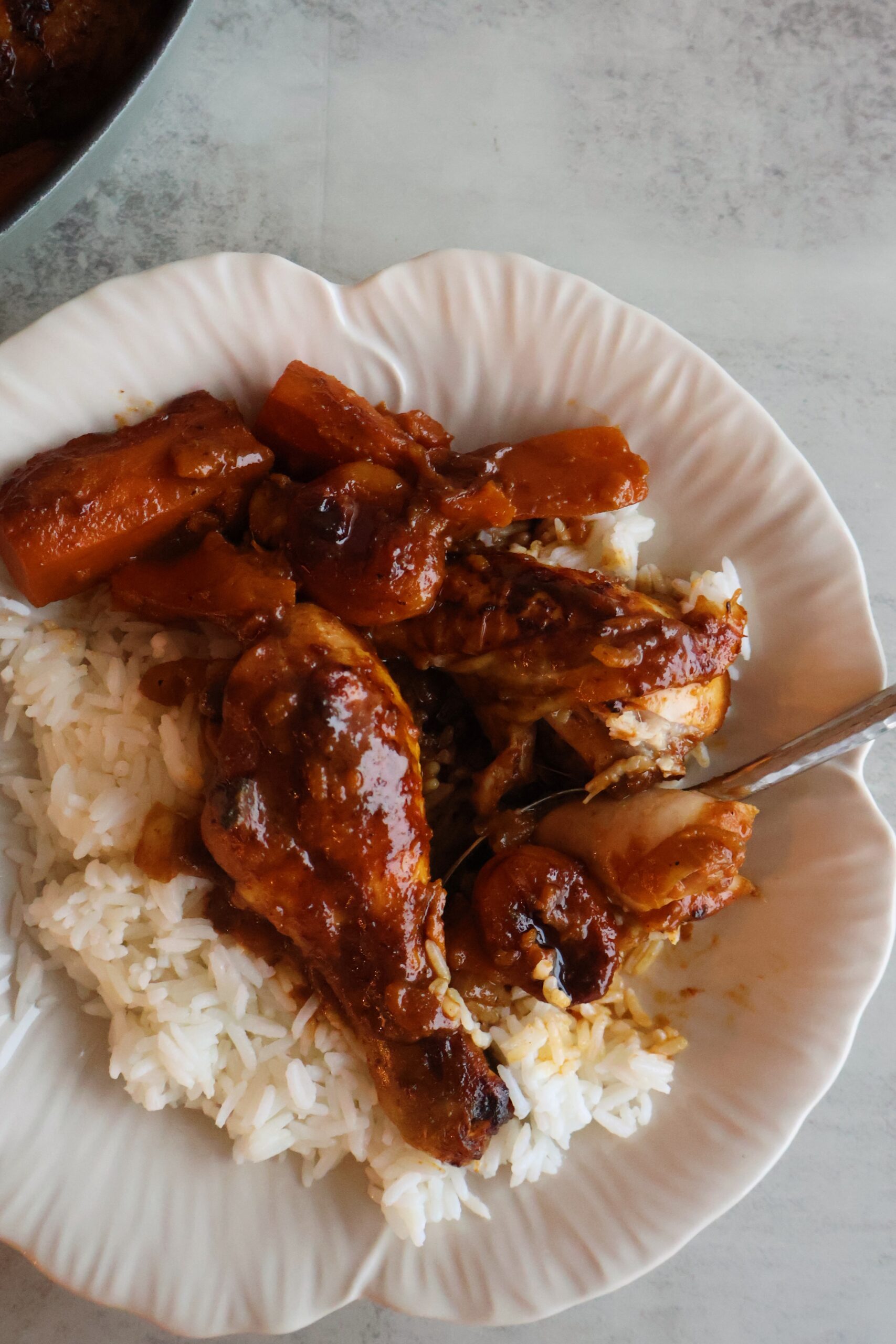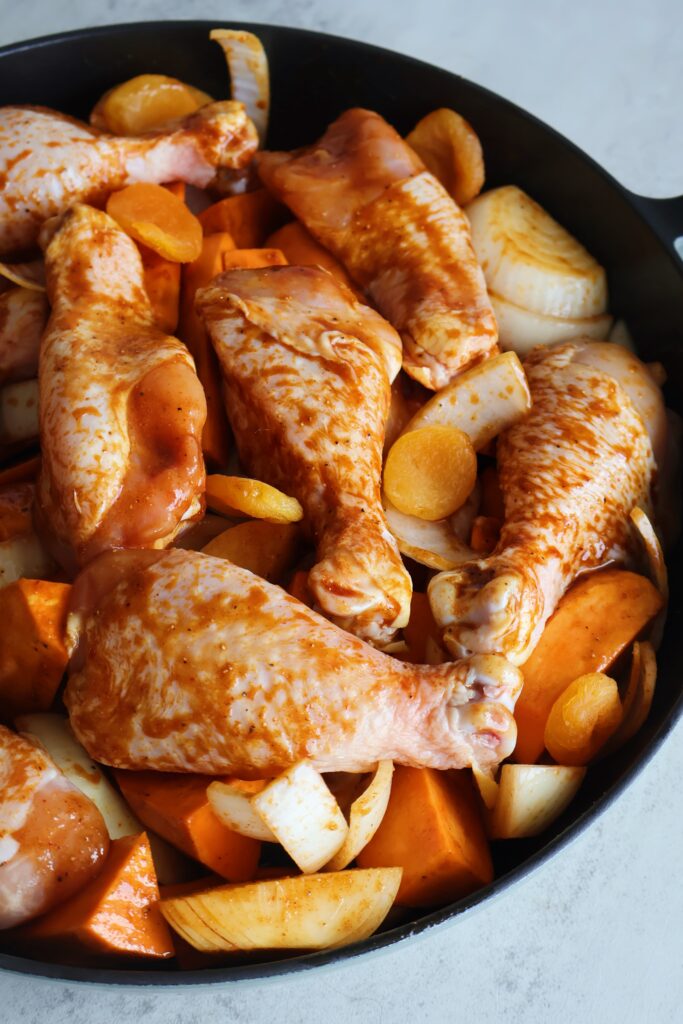 I prepared this using bone-in chicken drumsticks, sweet potatoes and onions, and added in dried apricots throughout. I love serving it over my Mushroom Rice Pilaf for a flavor-packed dinner.