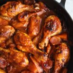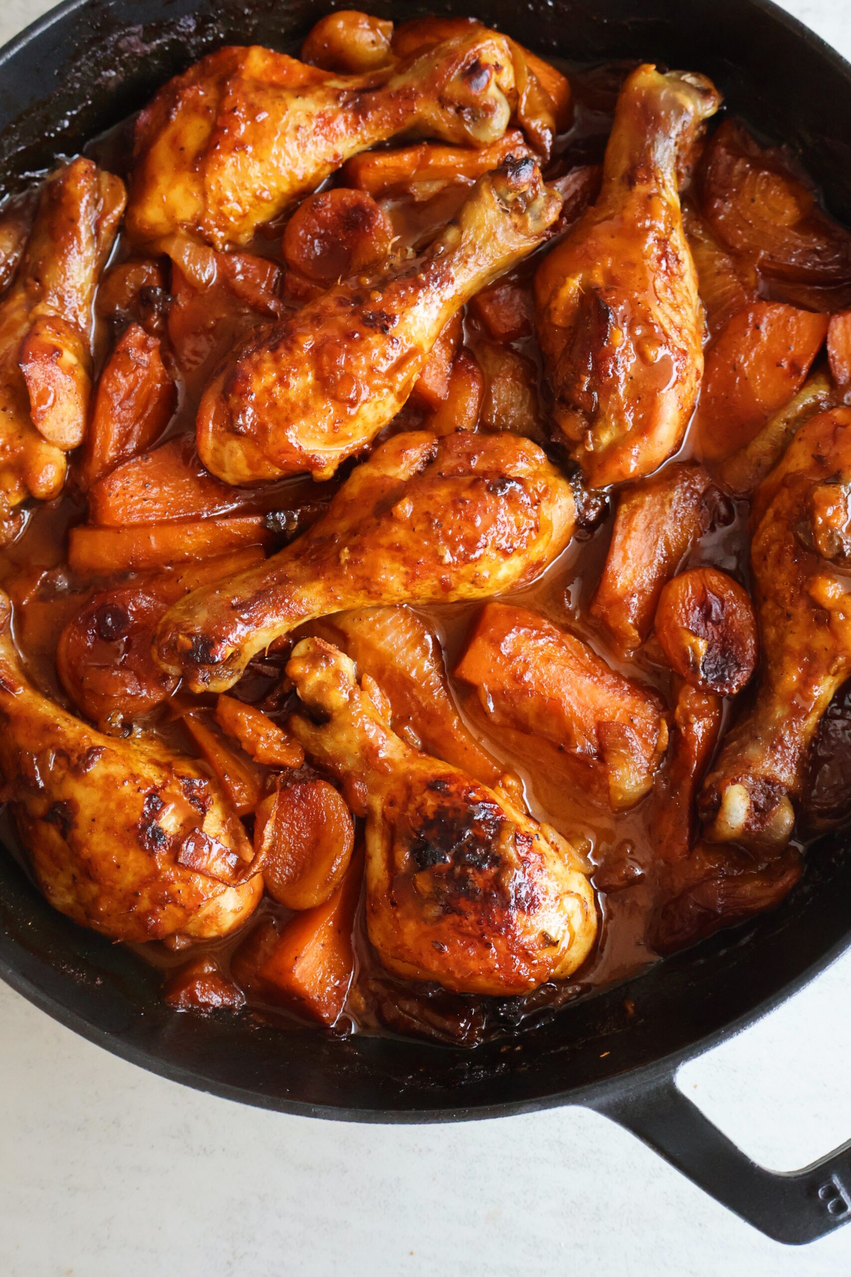 Sweet glazed chicken drumsticks with sweet potatoes is a delicious dish that comes together in one pan, with minimal prep work. The chicken and potatoes are cooked in a sweet and tangy date syrup marinade made from soy sauce, date syrup, dijon mustard and olive oil. It’s a simple dish to make with so much depth of flavor.