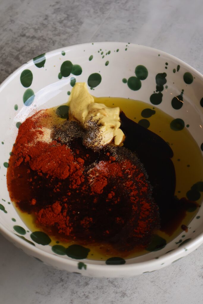 - Prepare the marinade by whisking together the olive oil, soy sauce, date syrup, dijon mustard and spices. Set aside