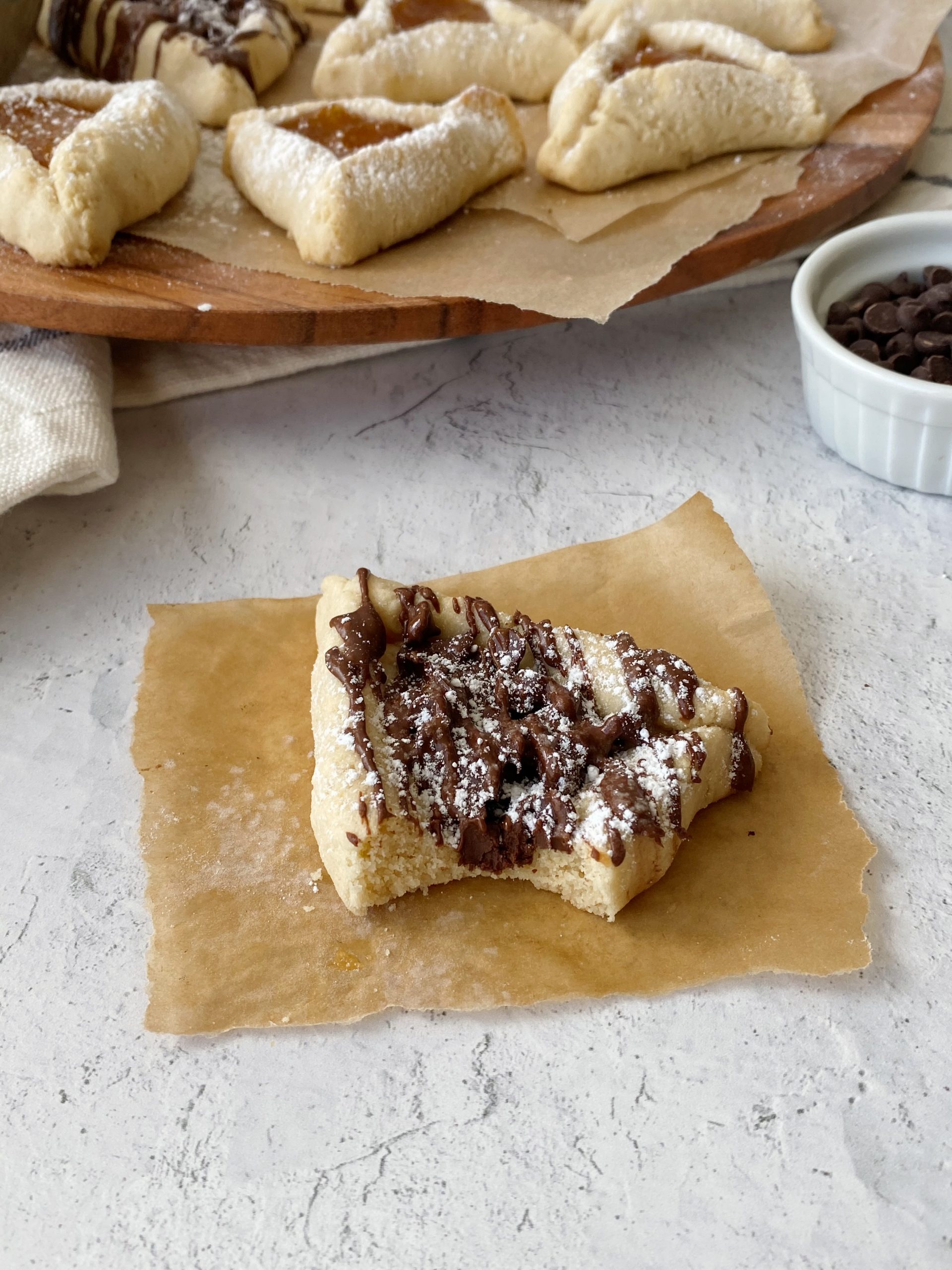 I know this flavor isn’t traditional, but it’s definitely a fun flavor to make! For a funfetti hamantaschen, mix your dough with rainbow sprinkles while rolling it out. Form your triangles and leave them empty. Freeze them for 20 minutes, and then bake them as instructed. Once they’re baked and cooled, fill them with your favorite vanilla icing. I love using this dairy-free one!