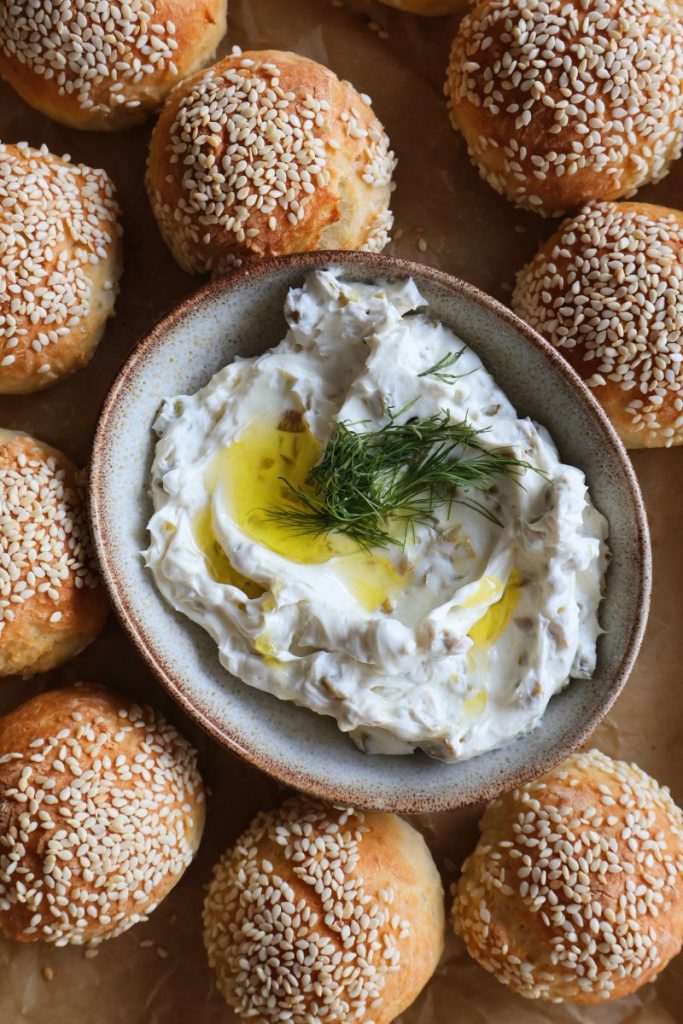 - With oiled hands, scoop out a golf ball-sized piece of dough and flatten into a circle, then place onto a parchment paper lined tray. Repeat with remaining dough.