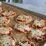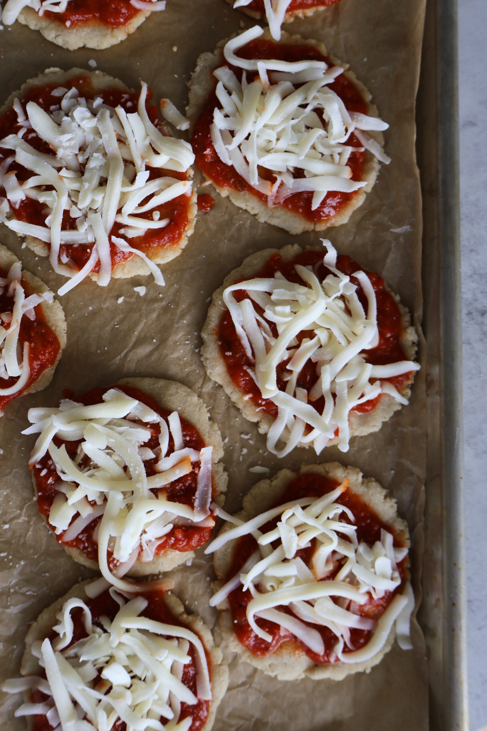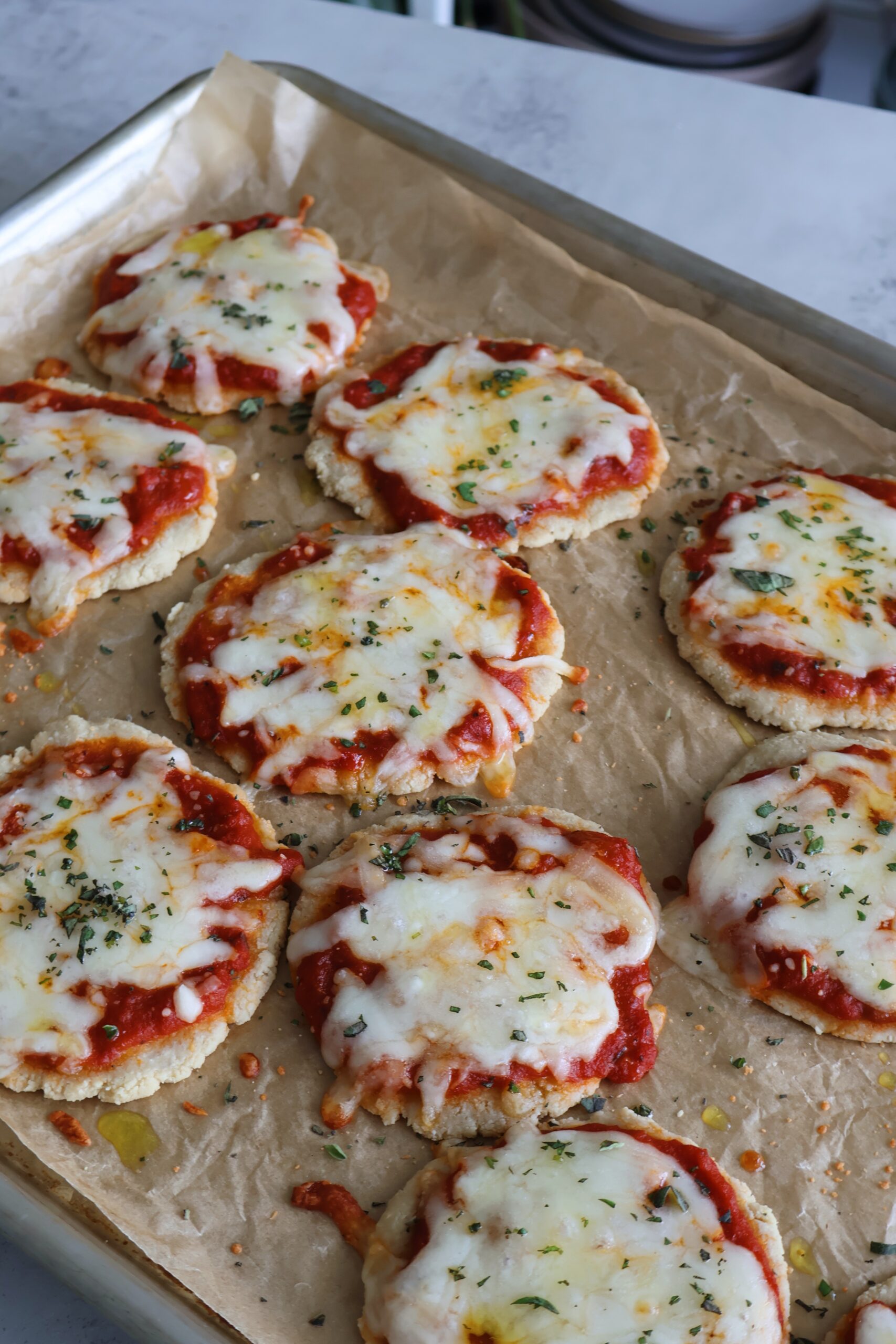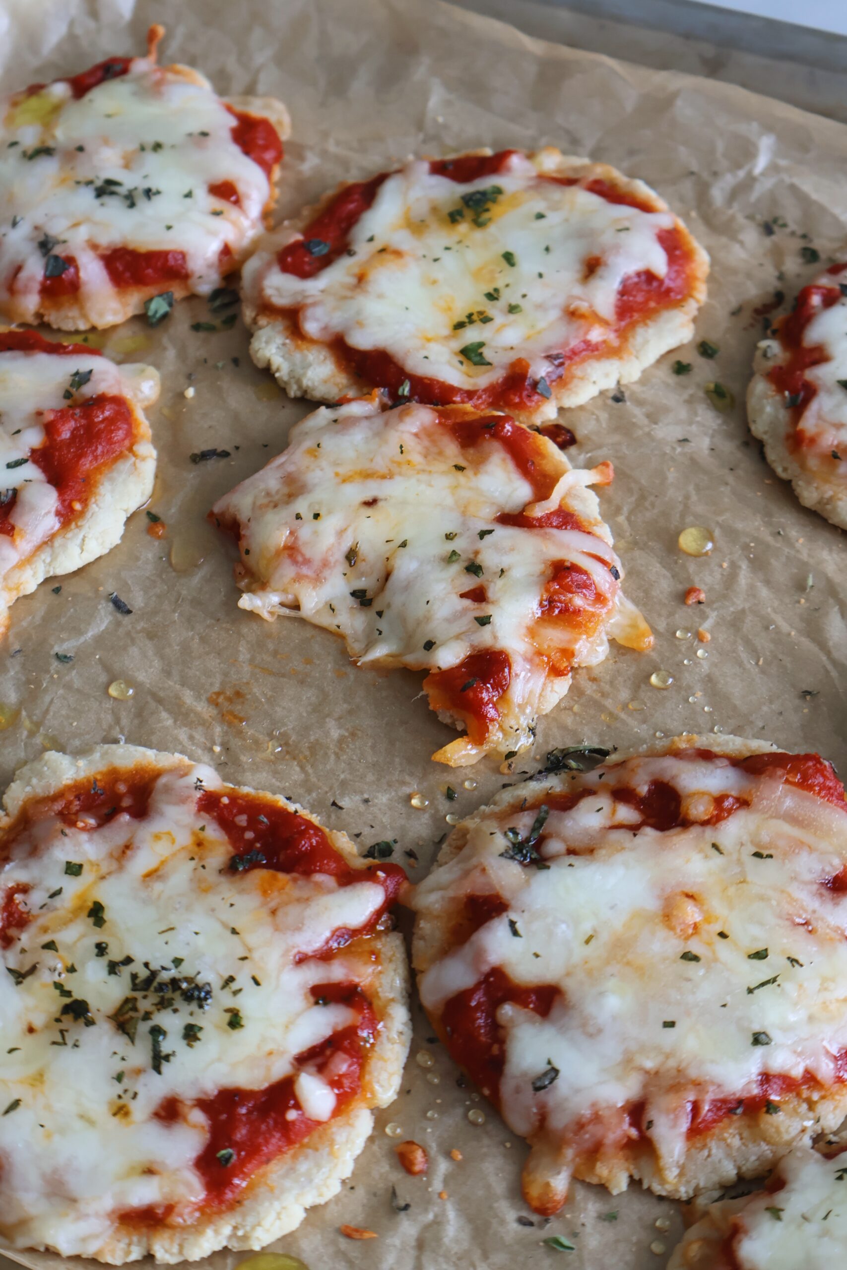 These gluten-free mini pizzas come together so easily for a work-week lunch or freezer prep. They’re made with almond flour, tapioca flour, eggs and olive oil with a little salt and baking soda, and baked with jarred marinara sauce and shredded cheese.