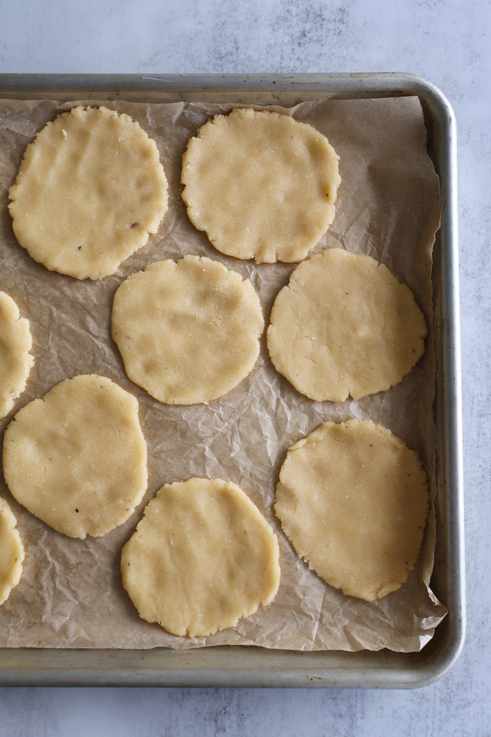 - With oiled hands, scoop out a golf ball-sized piece of dough and flatten into a circle onto a parchment paper lined tray. Repeat with remaining dough.