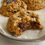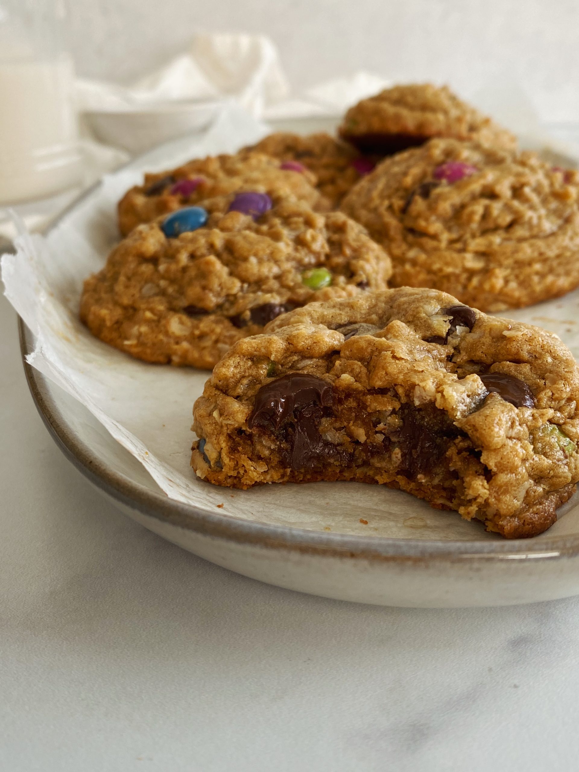 Loaded with peanut butter, oats, chocolate chips, and chocolate gems, these gluten-free monster cookies may just be one of my top 3 favorite cookie recipes. They come together in one bowl, don’t require any chilling, and are the perfect combination of a crisp and chewy cookie.