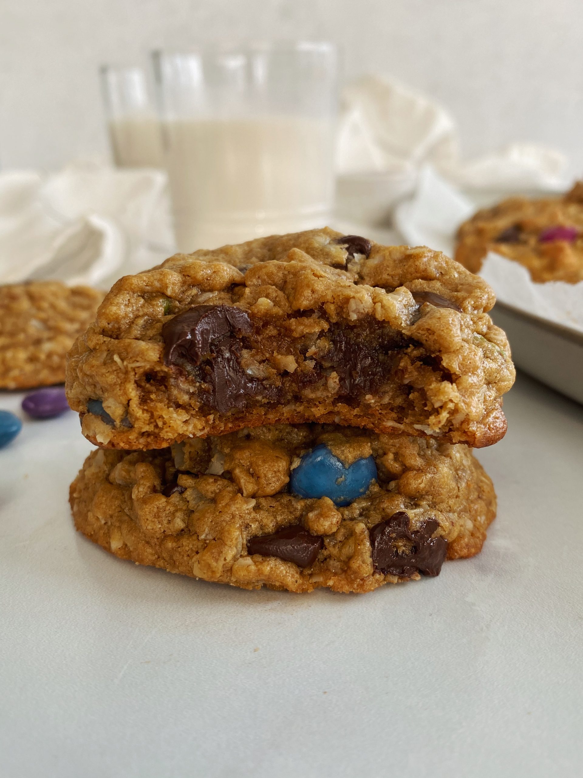 These gluten-free monster cookies have crispy bottoms and thick, soft centers. They truly pack in all the best flavors like creamy peanut butter, chocolate chips and hearty oats.