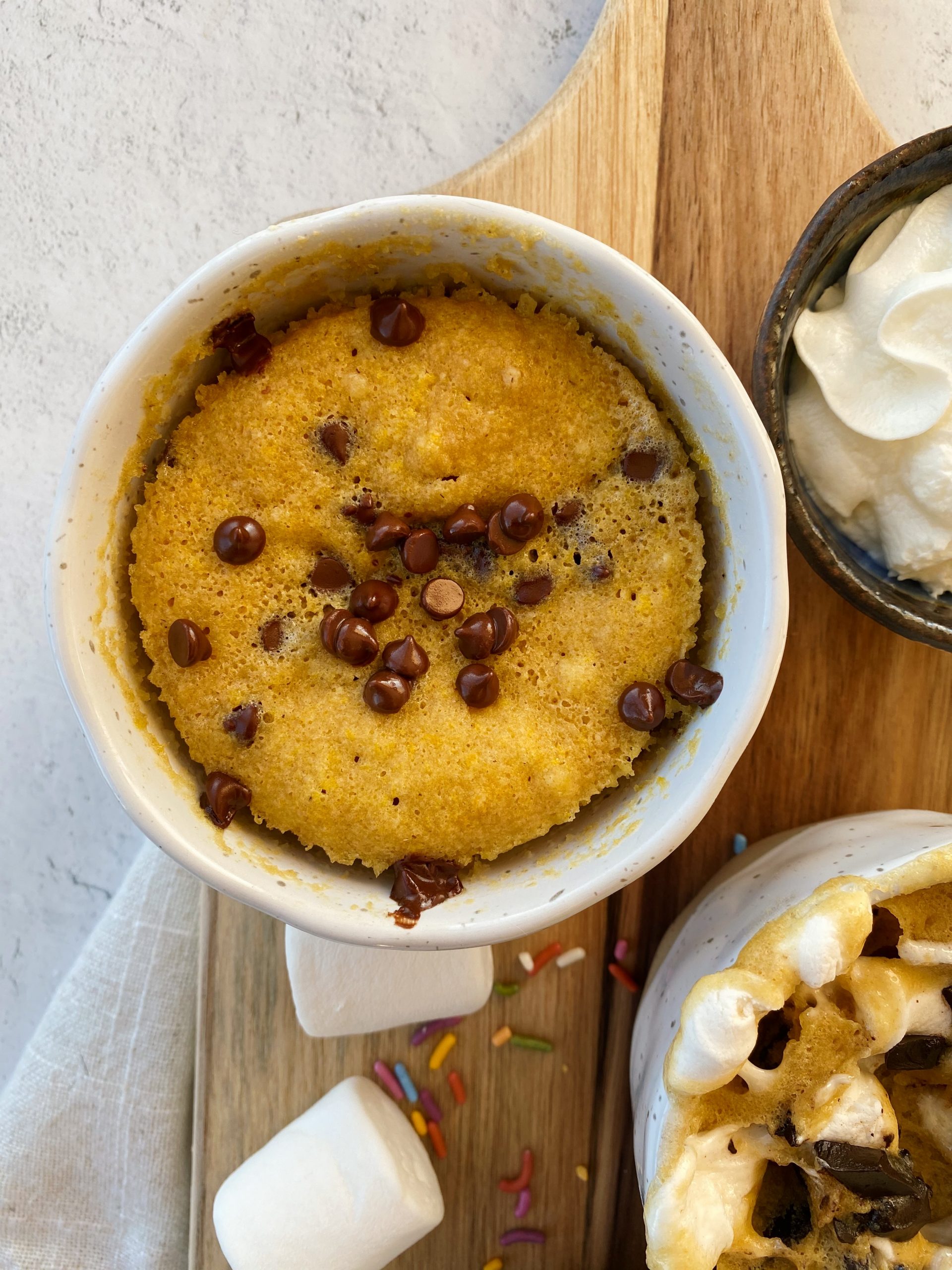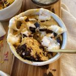 For the classic chocolate chip flavor, all you’ll need is chocolate chips to mix in and some sea salt to top. If you’re feeling fancy, you can top your chocolate chip mug cake with some vanilla ice cream!