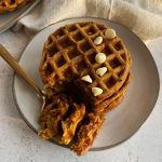 These waffles are made with oat flour, pumpkin puree, and warm fall spices like cinnamon, nutmeg and ginger. I love the combination of white chocolate in these, but they’re totally optional or can be swapped for regular chocolate chips!