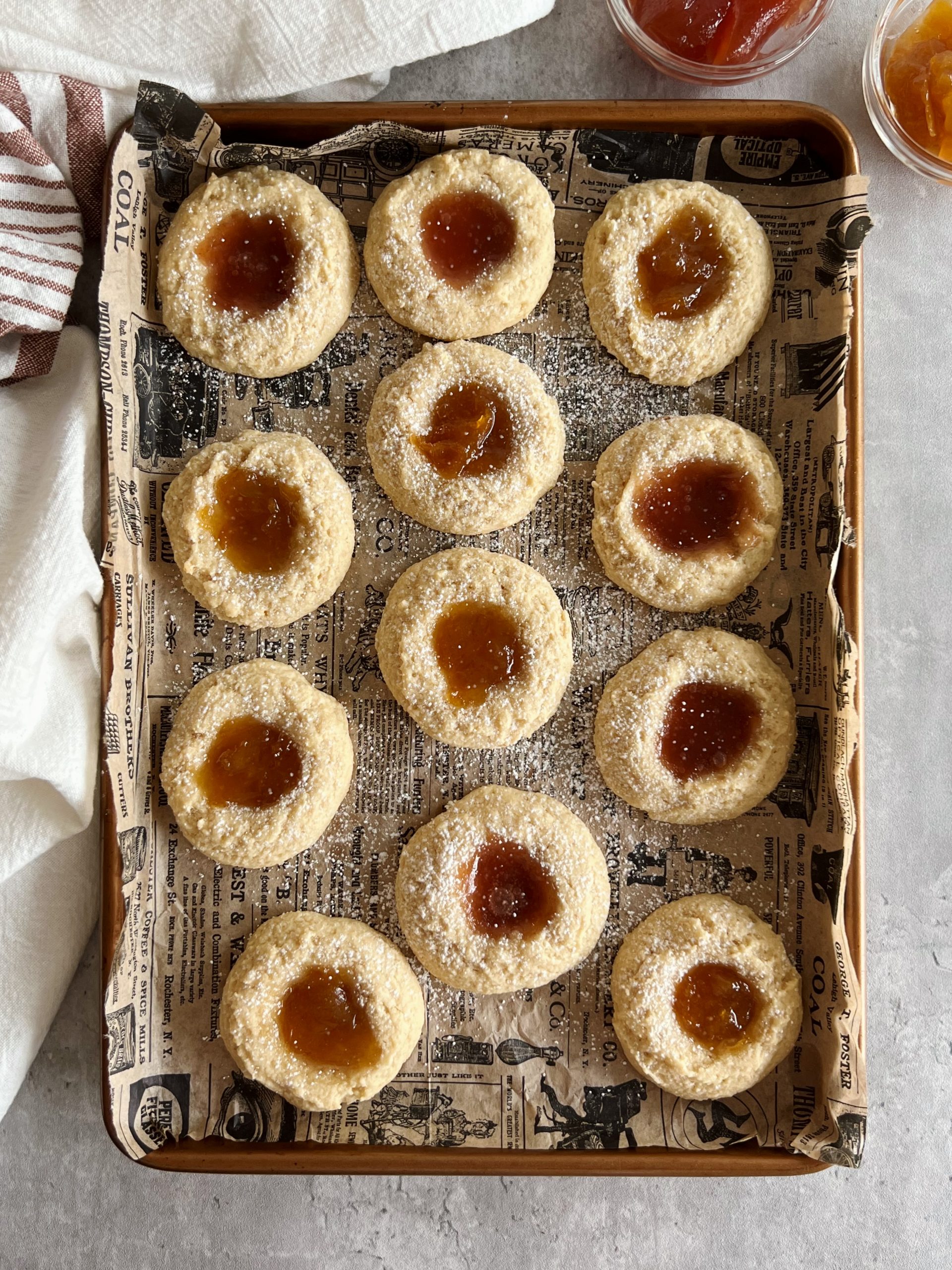Thumbprint cookies are traditionally made with raspberry jam, but I used apricot and strawberry for my batch.