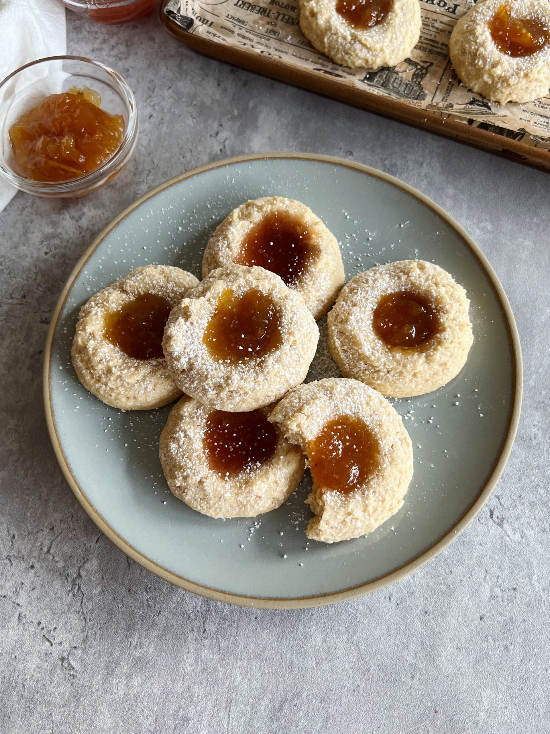 The most delicious gluten-free thumbprint cookies made from a simple shortbread base with a warm jam center. They’re the perfect treat for this holiday season!