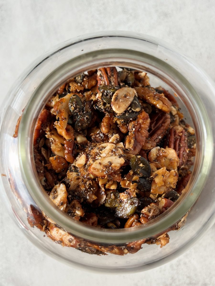 The nuts and seeds get mixed with a maple syrup and coconut oil glaze and come out so crispy and crunchy.