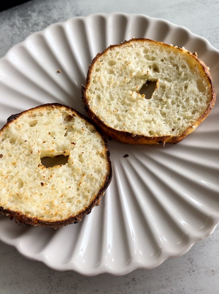 - When serving, I like to slice my bagel and toast it for 2 minutes to crisp the inside.
