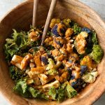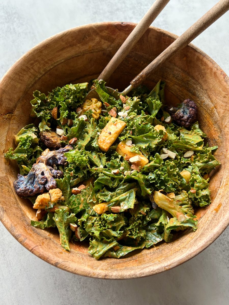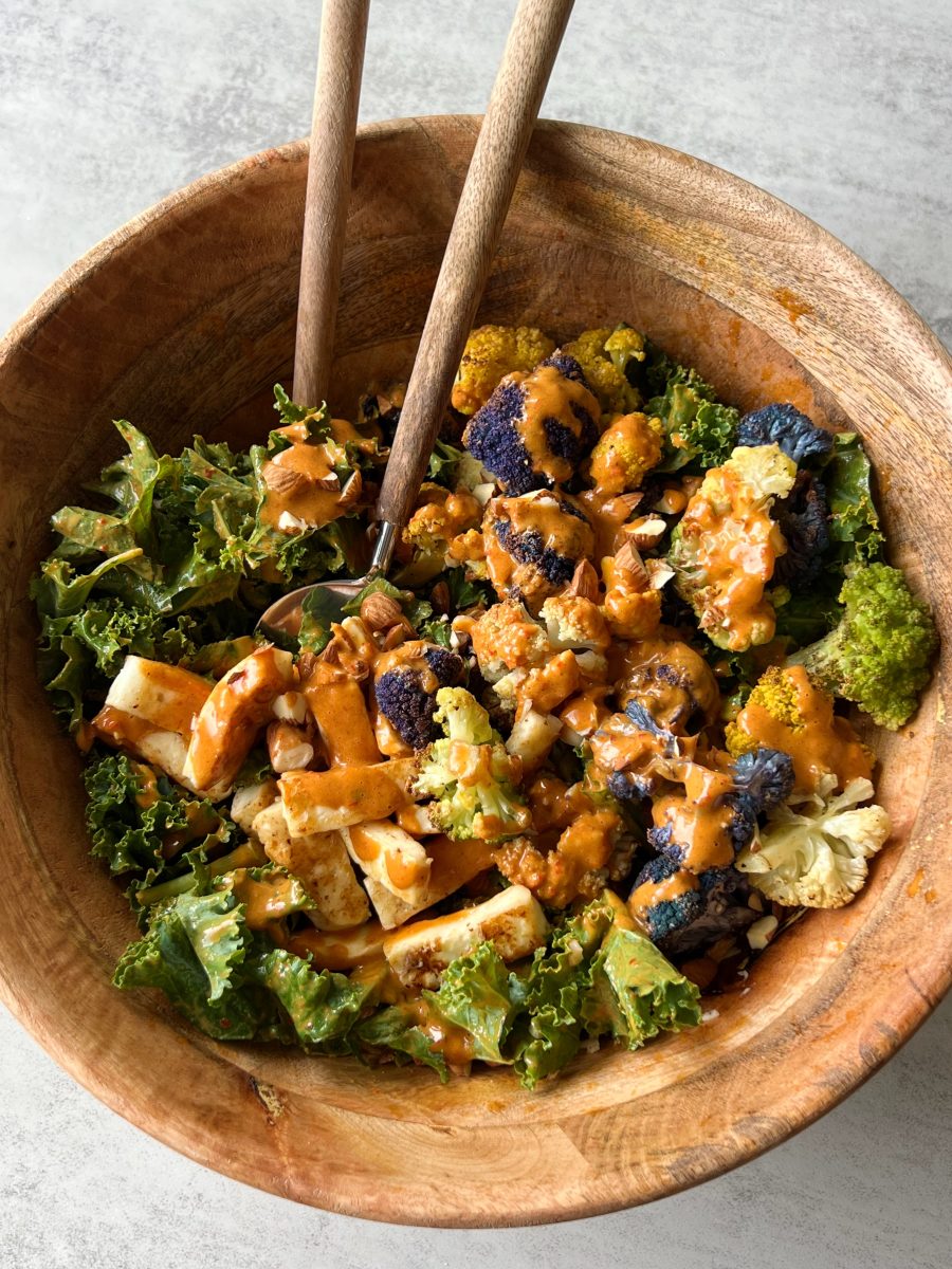 The kale is massaged with a creamy harissa almond butter dressing, then tossed with grilled halloumi, roasted cauliflower, and chopped almonds. Serve this alone or with your favorite salmon for an easy weeknight meal.