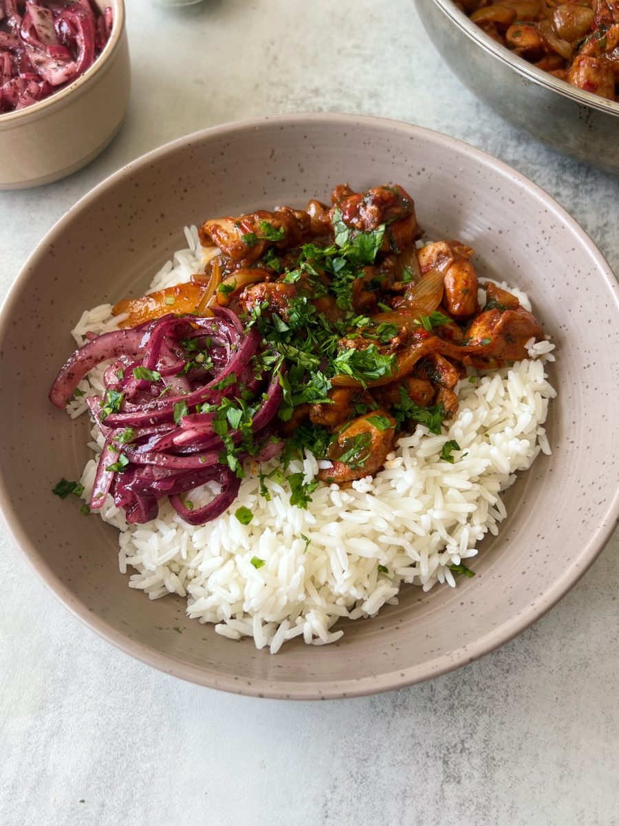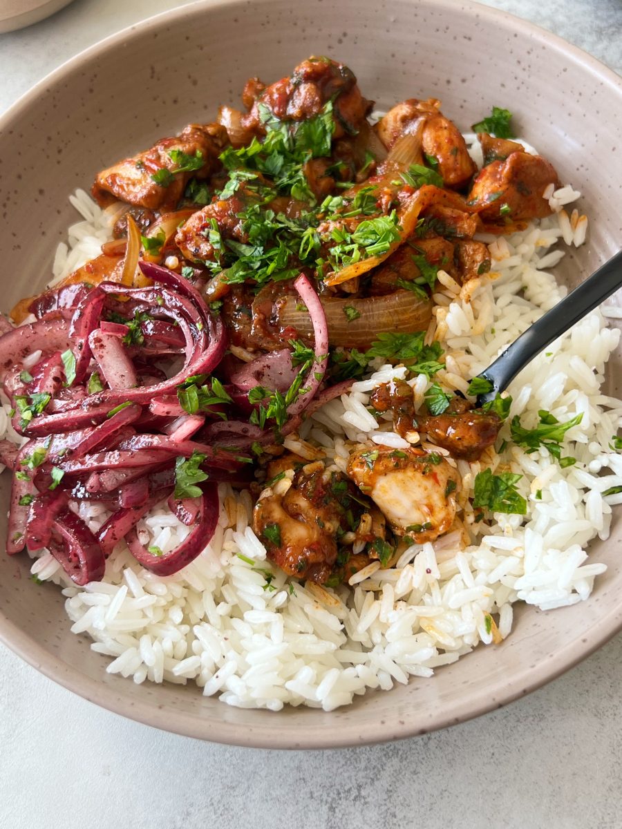 The sweet and spicy sauce pairs so well with chicken thighs or breast. I love serving it over a bed of rice with my sumac onions.