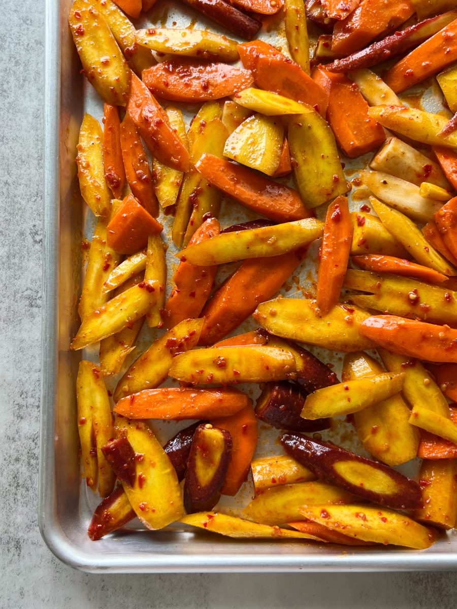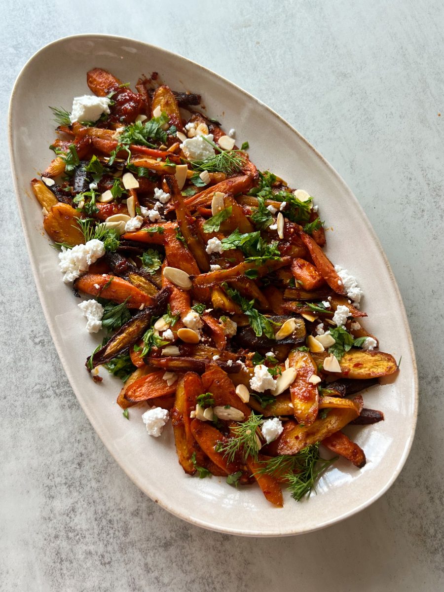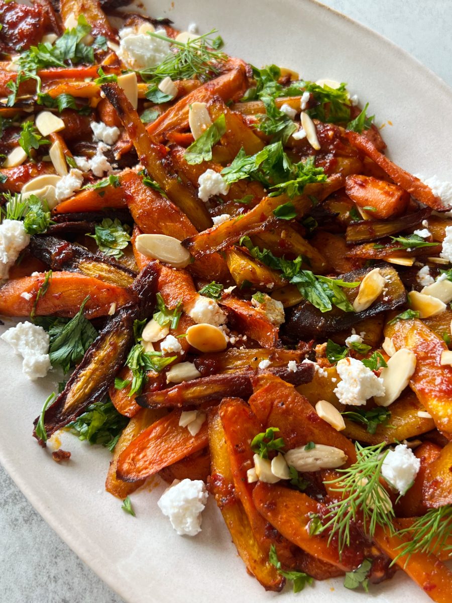 These spicy carrots are a delicious, flavor-packed side dish to serve for dinner. The rainbow carrots are tossed in a homemade harissa marinade and baked until they’re crispy and tender.