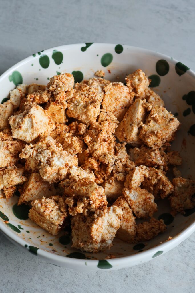 - Start by crumbling the tofu into chunks. Add it to a bowl and toss with your spices and tapioca flour
