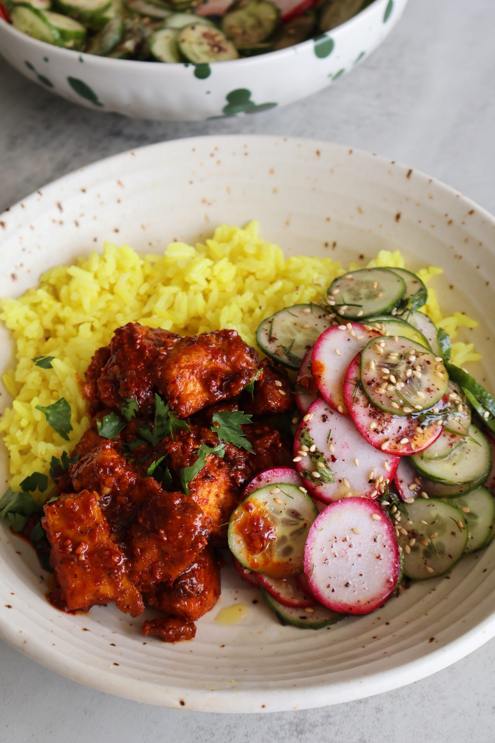 These tofu bowls pack in delicious flavor from all of the components. The crumbled tofu nuggets are tossed in a sweet and spicy harissa glaze, the fluffy turmeric rice has hints of garlic and serves as the ideal base for the tofu, and the cucumber radish salad adds a crunchy freshness to finish it all off.