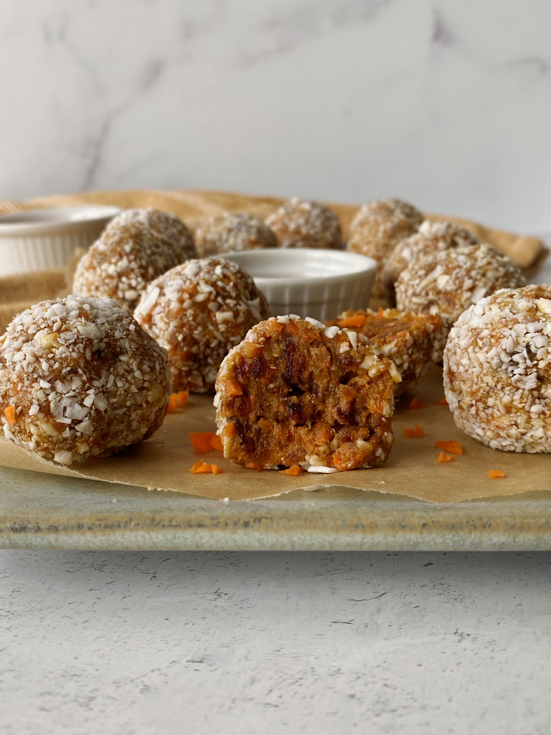 These delicious no-bake carrot cake bites are the perfect nutritious treat! They’re made with dates, nuts and fresh carrots, and are naturally sweetened! They take only 30 minutes to make, and are such a simple freezer snack to have on hand.