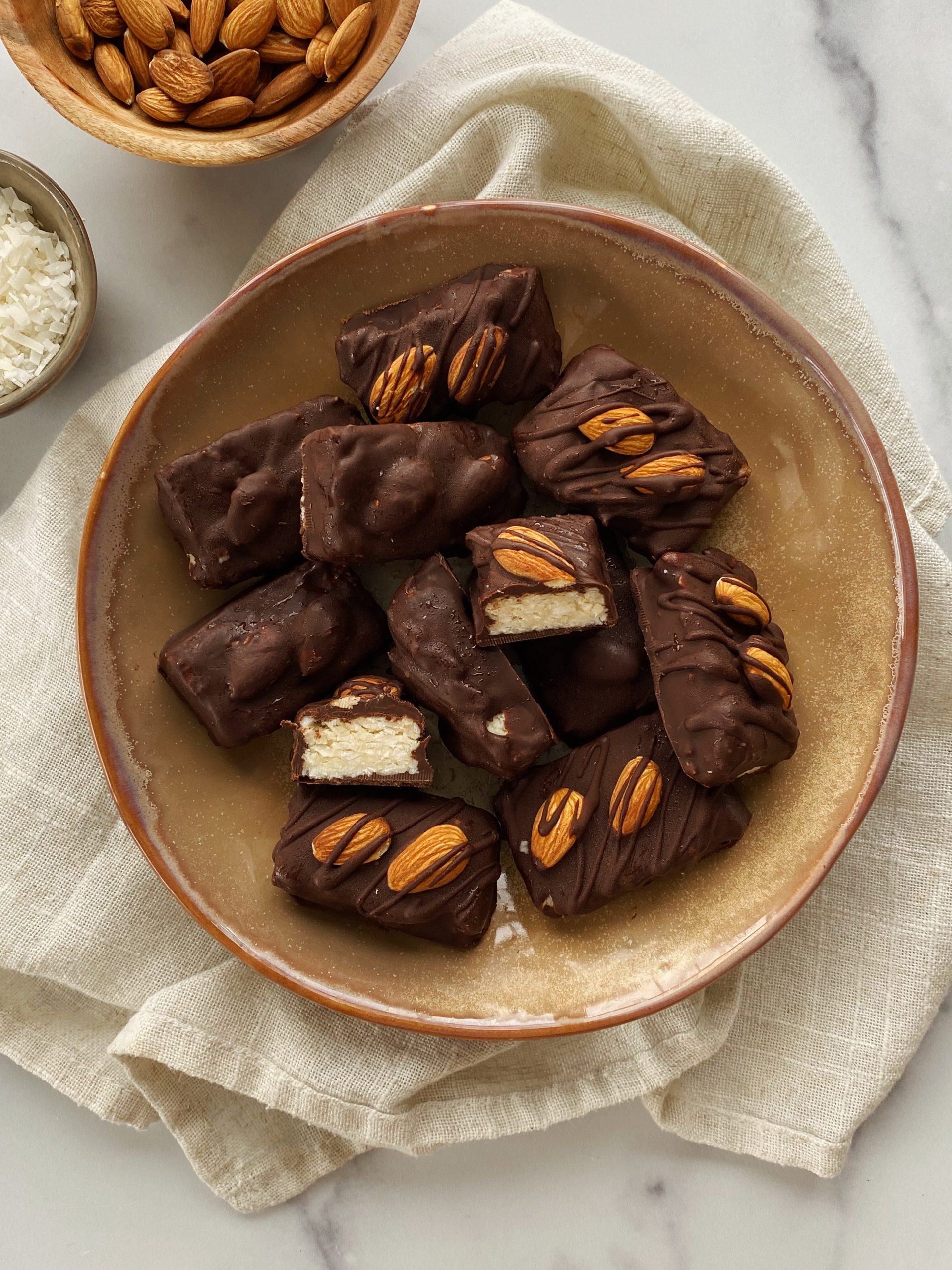 A delicious coconut bar topped with whole almonds, and coated in melted chocolate! These vegan almond joy are gluten-free, and and made with just 7 simple ingredients!