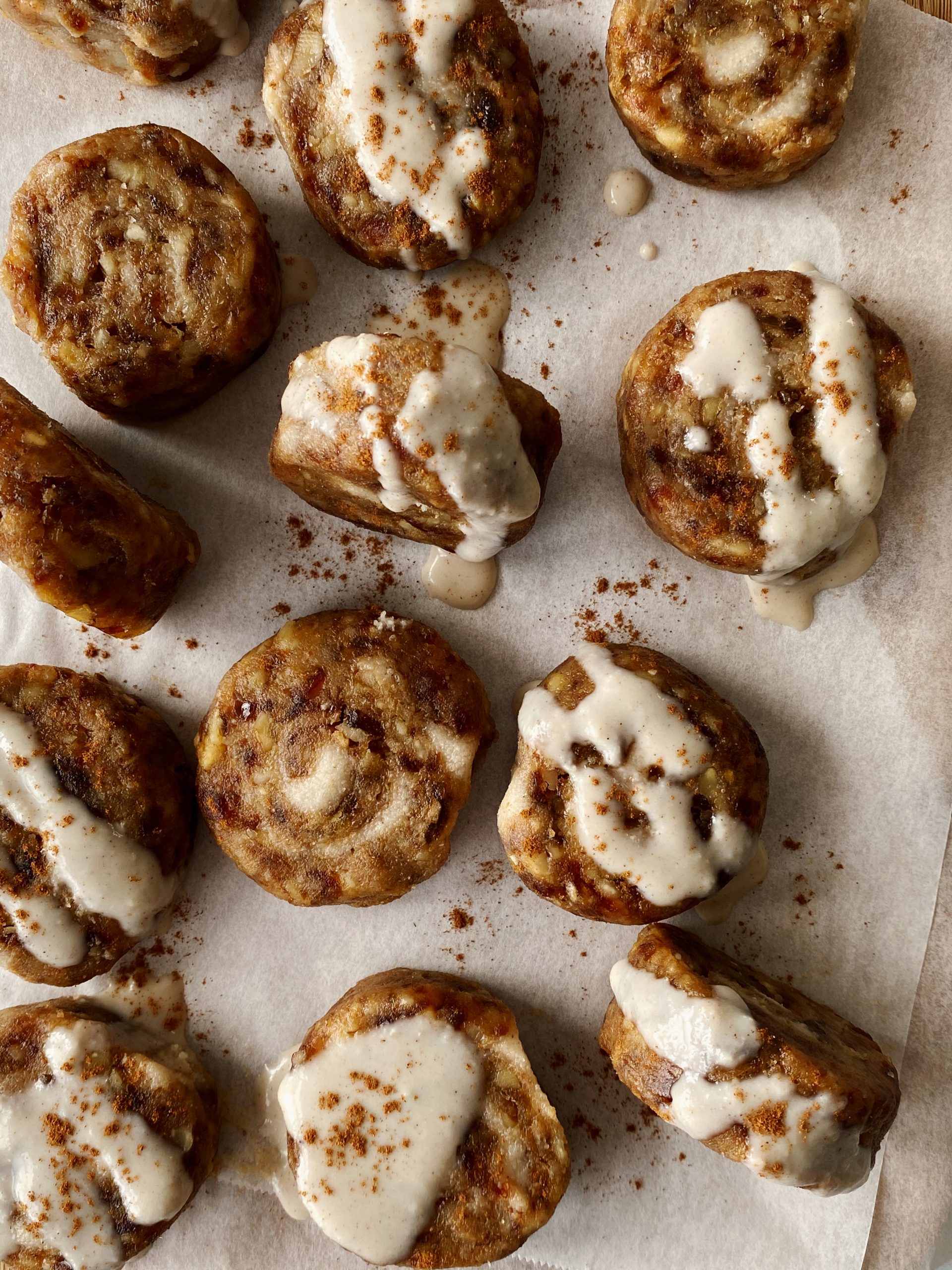 Raw, vegan cinnamon rolls! The most delicious date and nut crust rolled with a creamy cinnamon cashew filling, and topped with a sweet glaze and cinnamon. Truly all the best flavors.