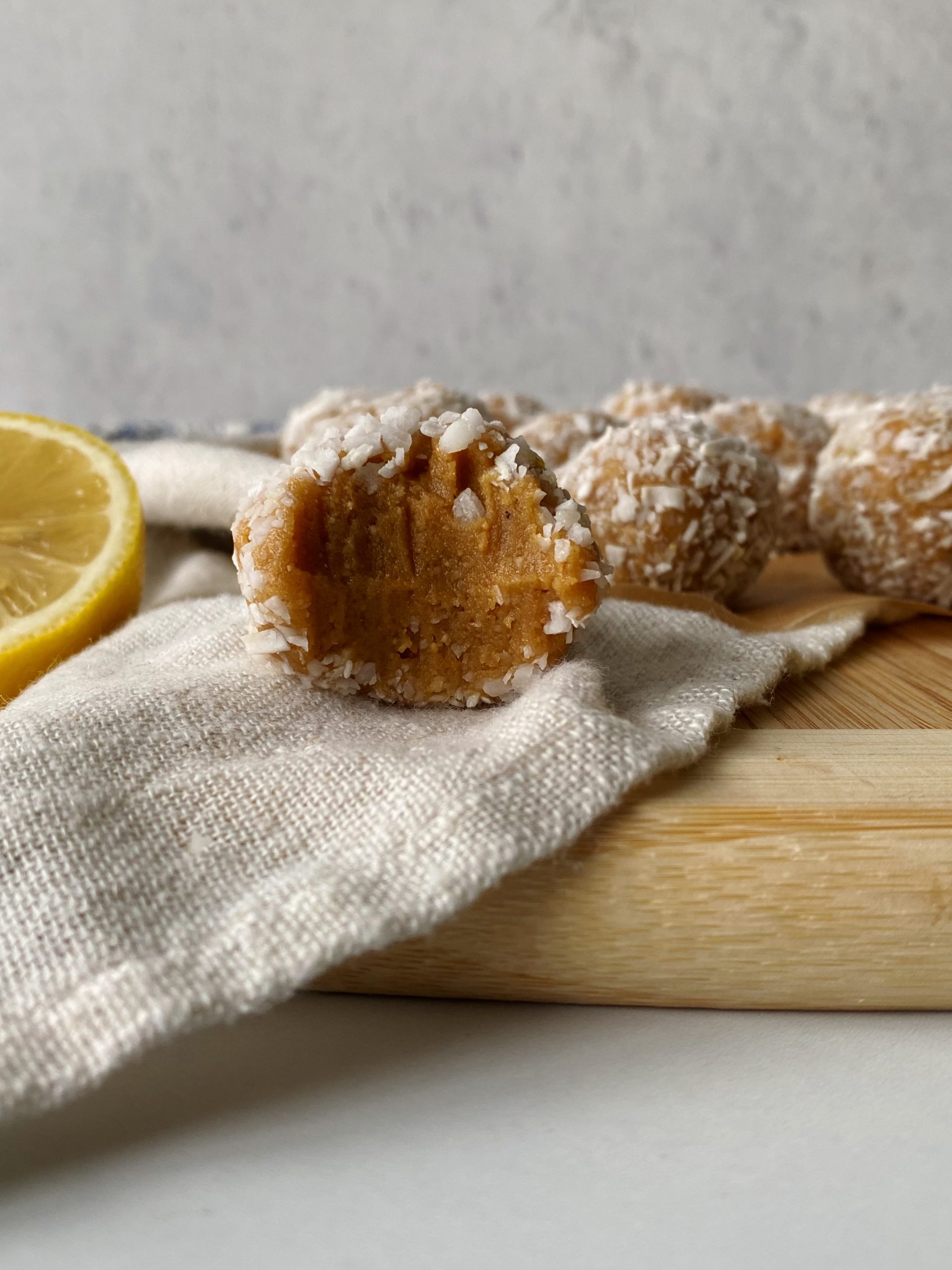 7-ingredient lemon coconut bliss balls! They’re made from cashew butter, lightly sweetened with pure maple syrup, and coated in shredded coconut. They’re a perfect treat to keep in the fridge or freezer.