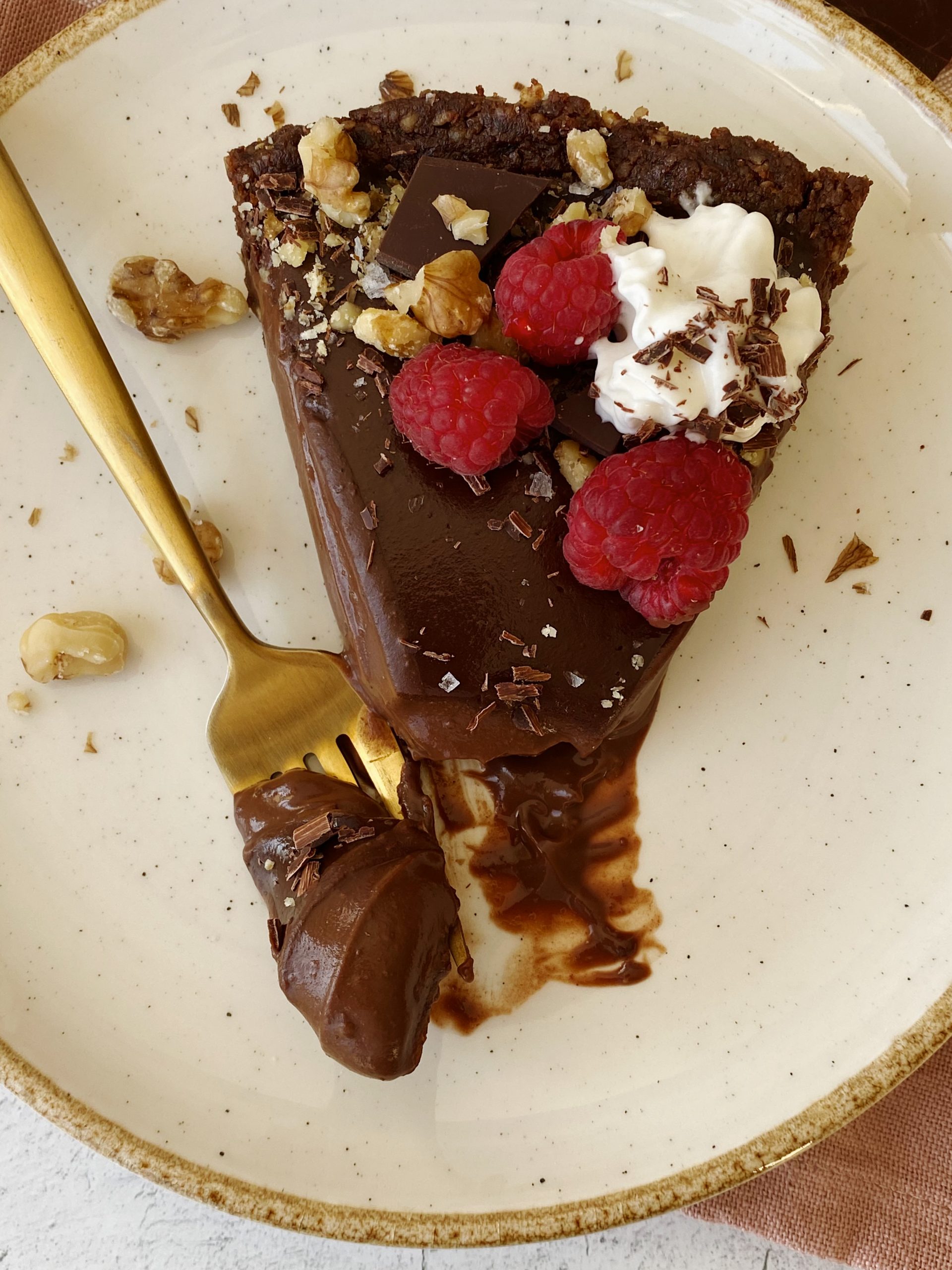 This delicious vegan chocolate tart is the perfect dessert to make this holiday! It’s made with a walnut date crust and has the creamiest four ingredient chocolate filing.