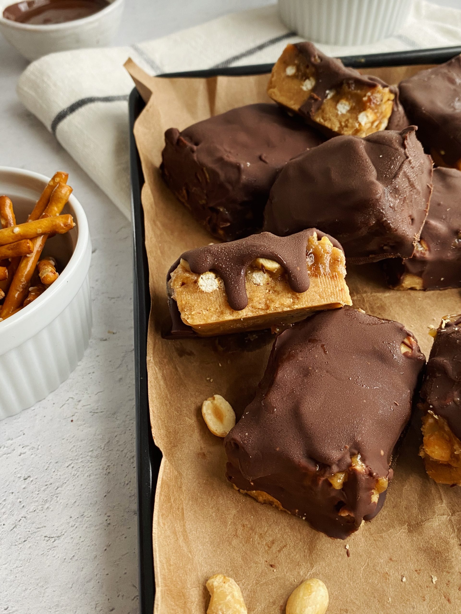 - Peanut butter layer– I went for the Reese’s Take 5 version, so I made a similar peanut butter base made from natural peanut butter, pure maple syrup and coconut flour
