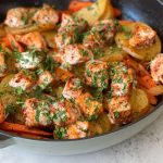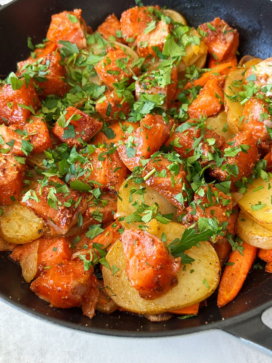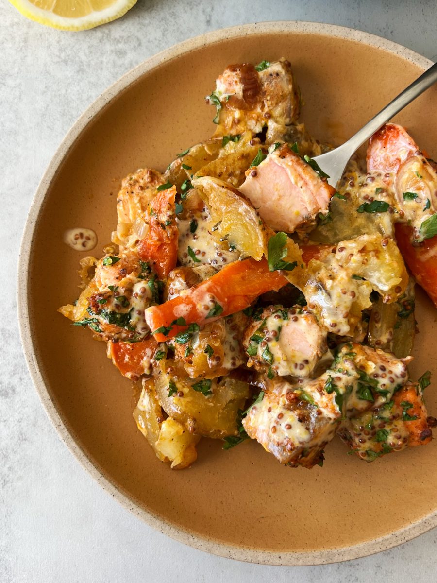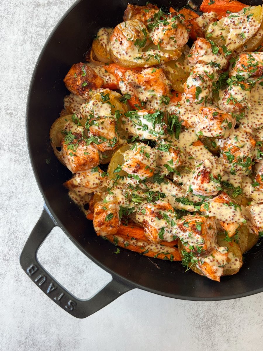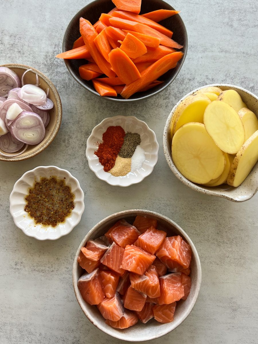 This one-pan honey mustard salmon bites dish is a personal favorite. It’s made with seasoned salmon cubes, sliced potatoes, carrots and shallots. The veggies get seasoned and baked first, then the salmon cubes get added to finish baking in the pan.