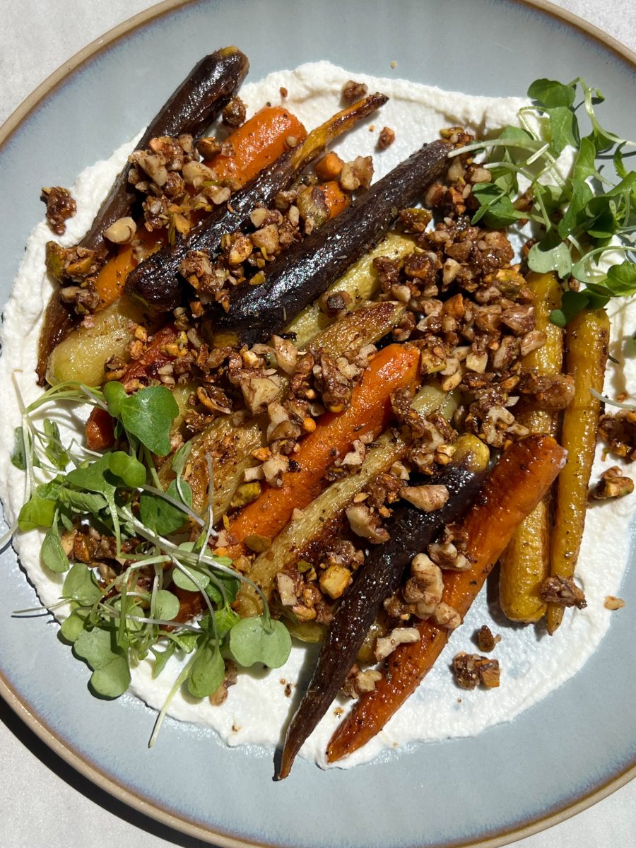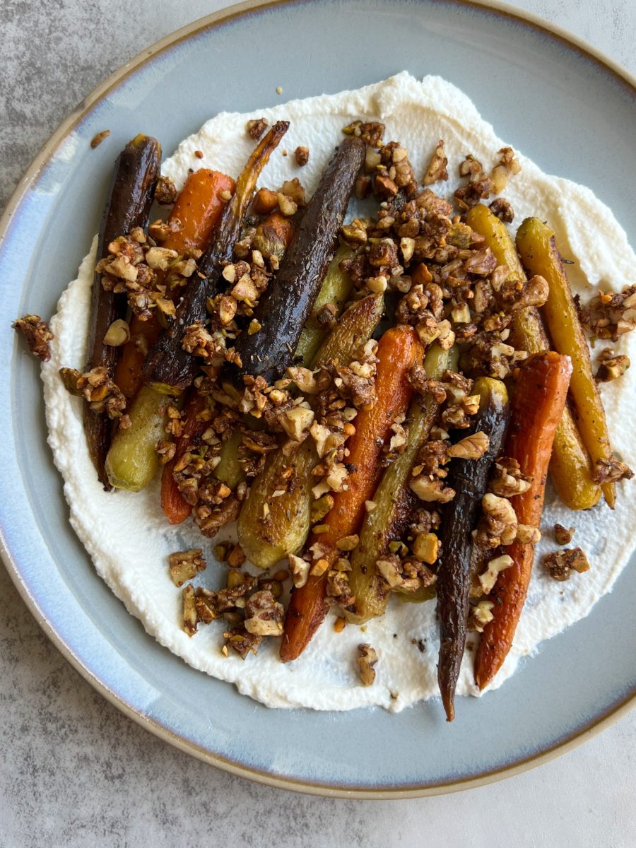 - Plate the roasted carrots over ricotta and top with the honey nut topping. I love to garnish the dish with microgreens for a pop of green