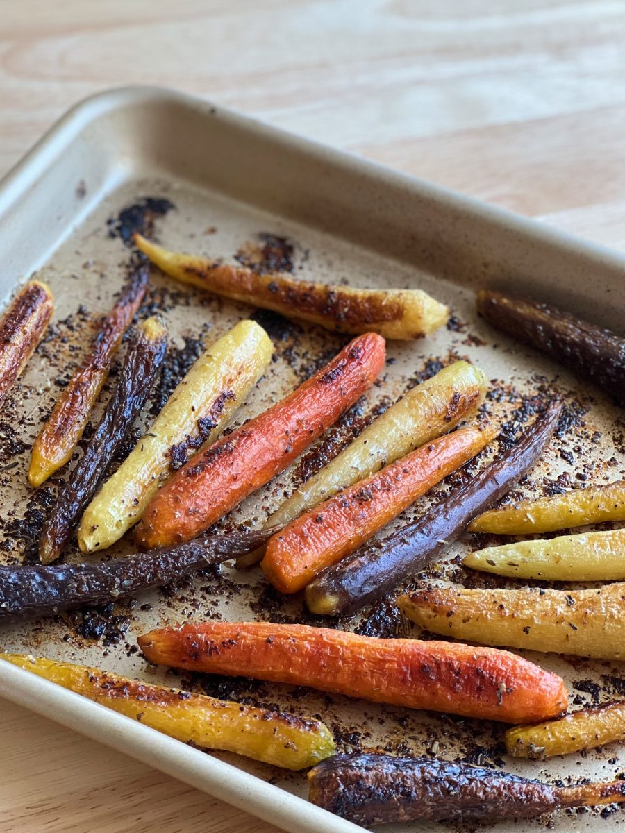 - 1 lb of carrots. I used petite colored carrots (from Trader Joe’s), but this recipe can be made with regular orange or rainbow carrots for a pop of color