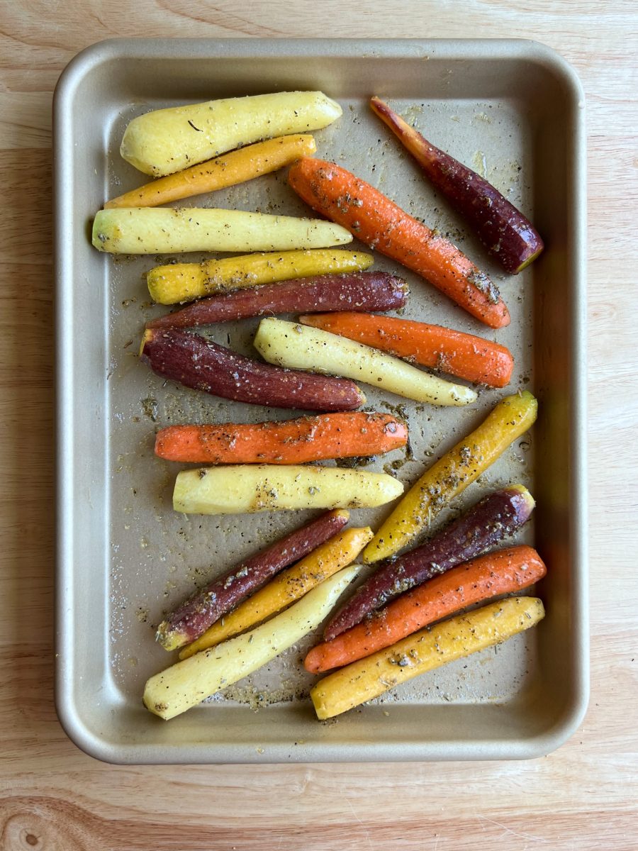 - Add the carrots to a sheet pan. If using petite carrots, leave whole. If using regular sized carrots, cut in half. Toss the carrots with the olive oil, honey and spices.
