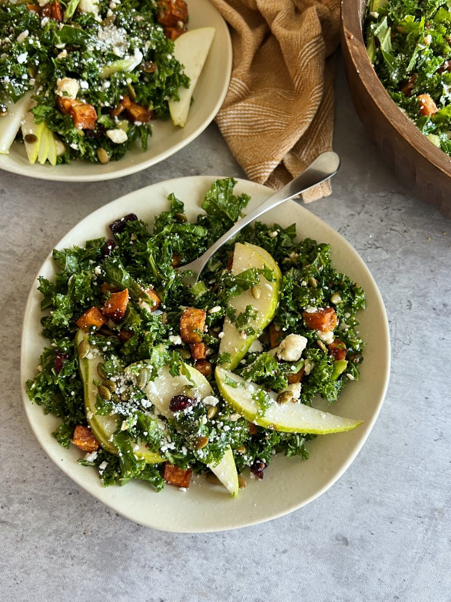Fall-inspired kale salad with roasted sweet potatoes and sliced pear. This salad is loaded with feel-good ingredients, and can even be made a couple of days in advance for an easy meal prep!