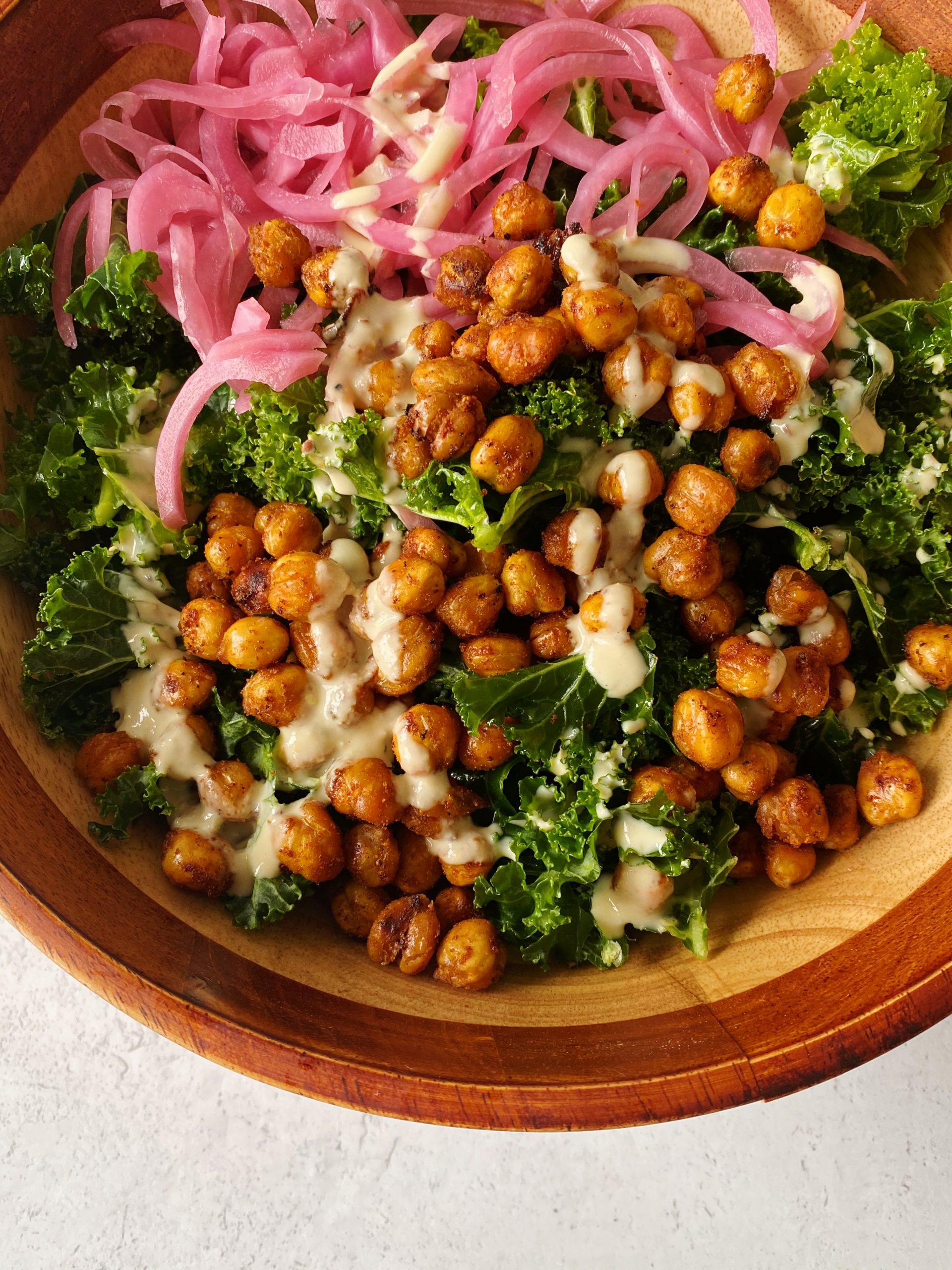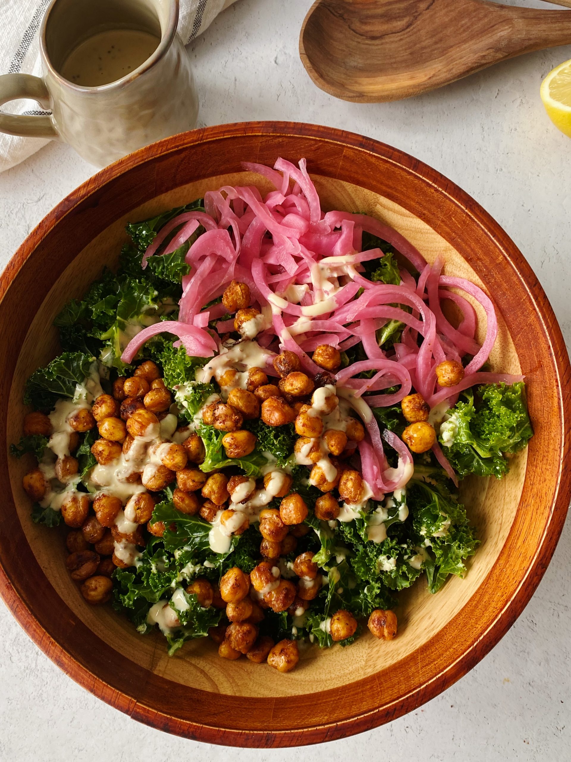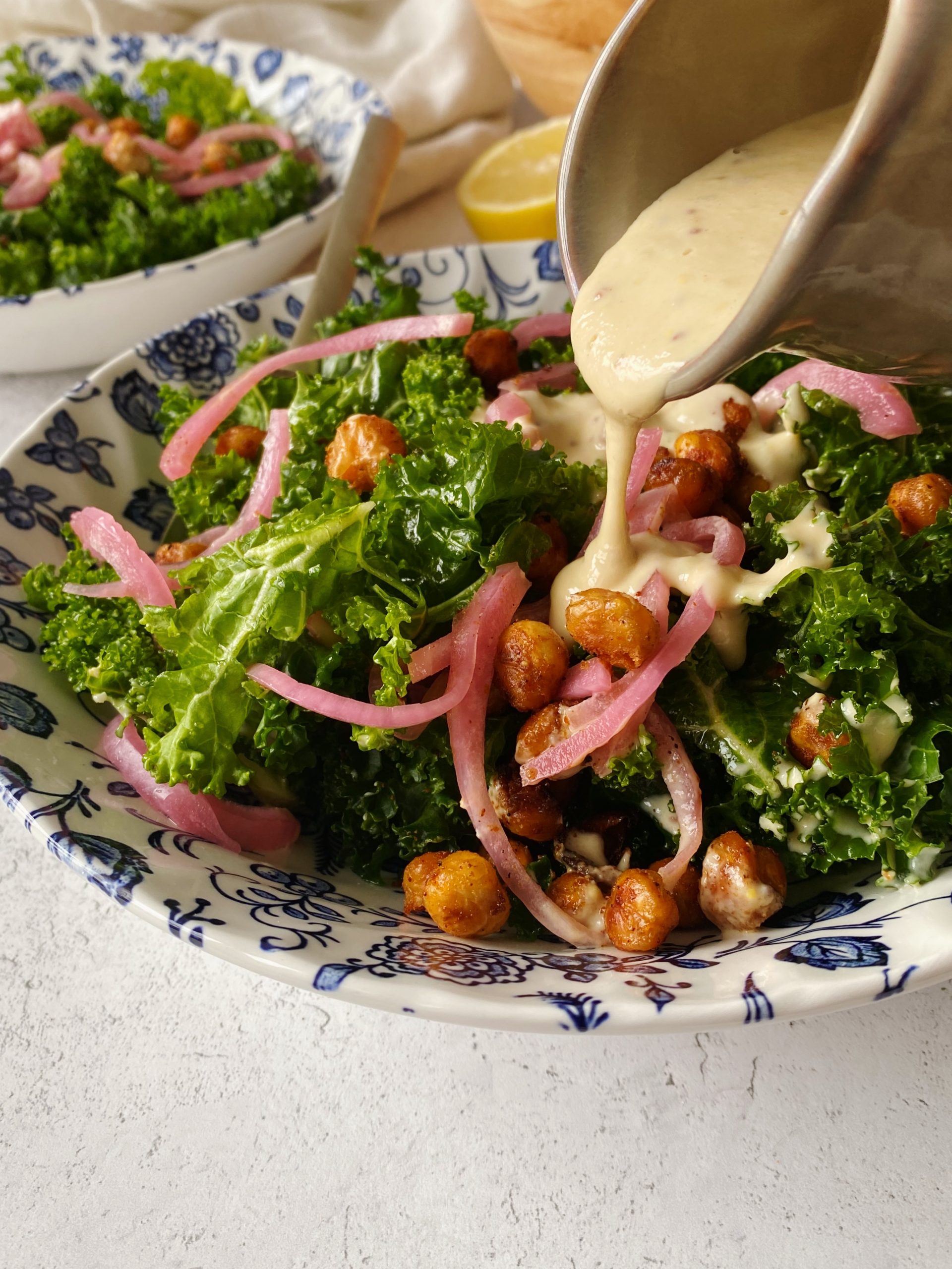 This kale tahini caesar salad is a delicious way to change up your veggie game! It has a creamy tahini dressing that’s massaged into a bed of kale, then topped with crispy spiced chickpeas and pickled red onions.