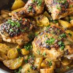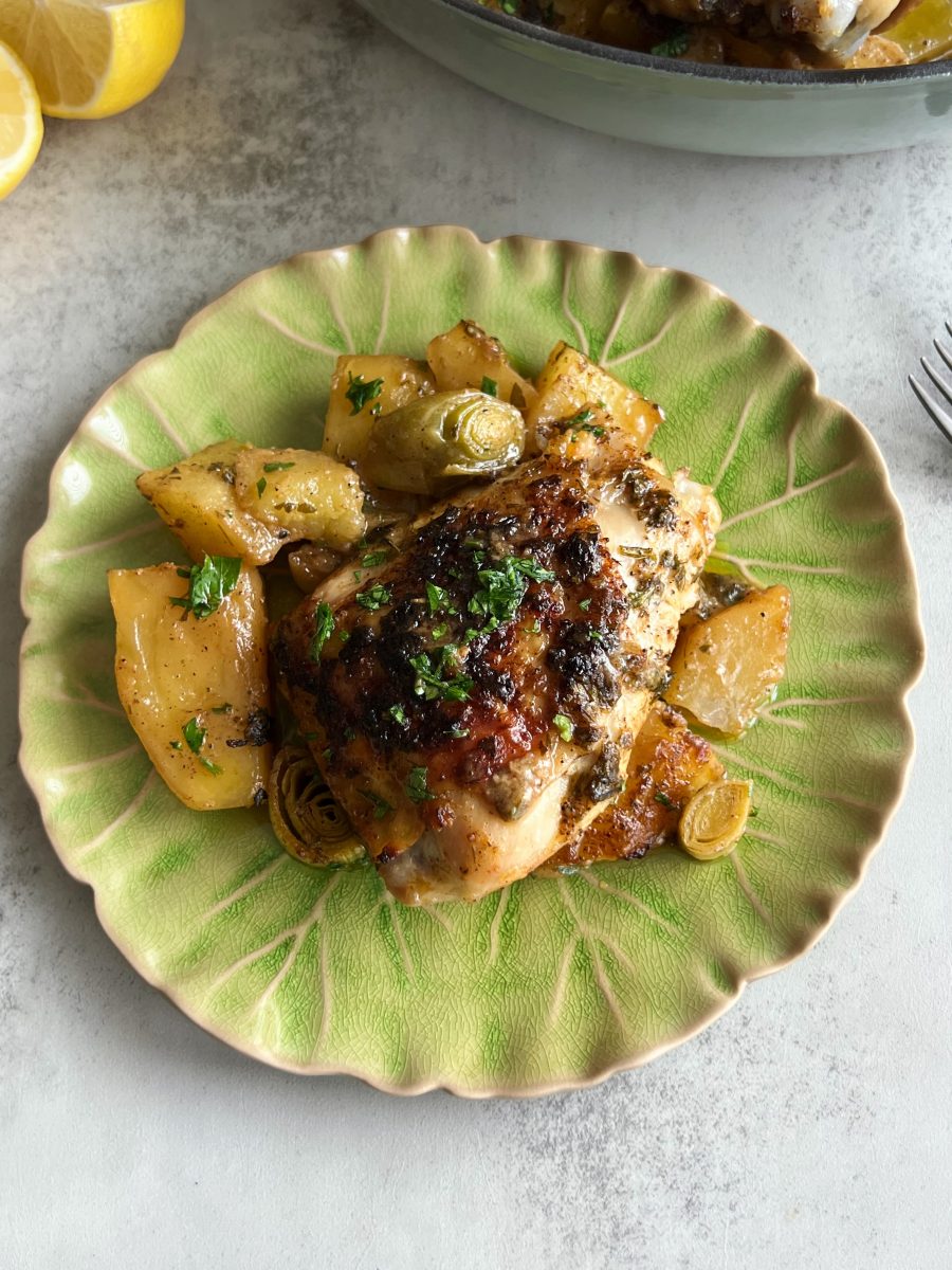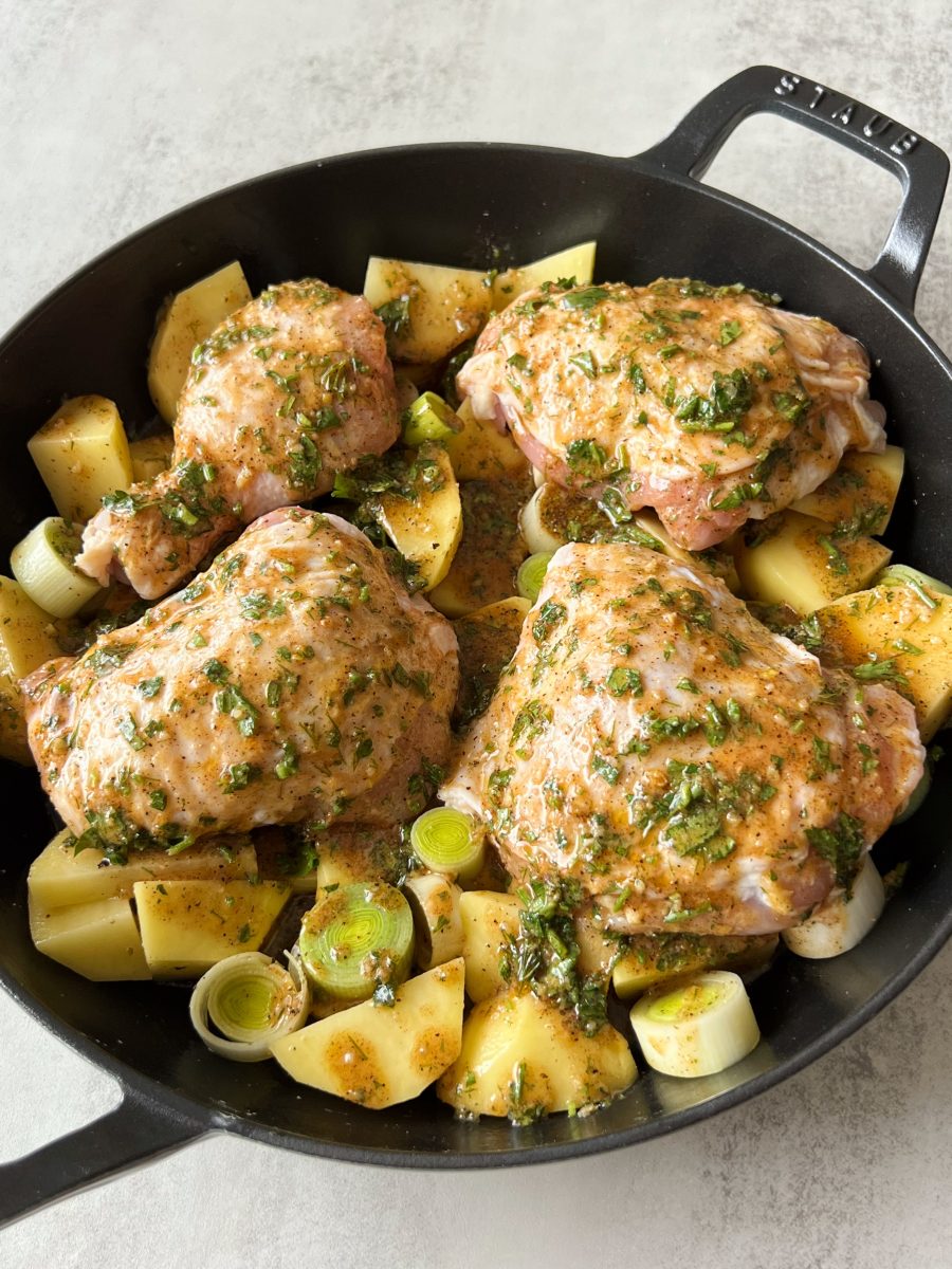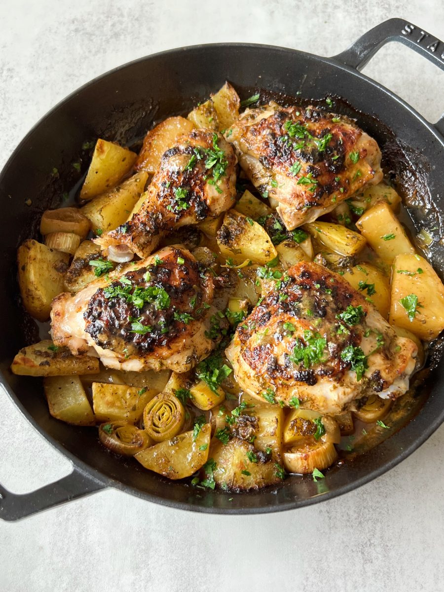 Lemon herb chicken thighs with potatoes and leeks are packed with zesty flavor, and comes together all in one pan. The marinade is made with lemon juice, olive oil, fresh herbs and some spices, and adds the perfect flavor to the chicken and potatoes.