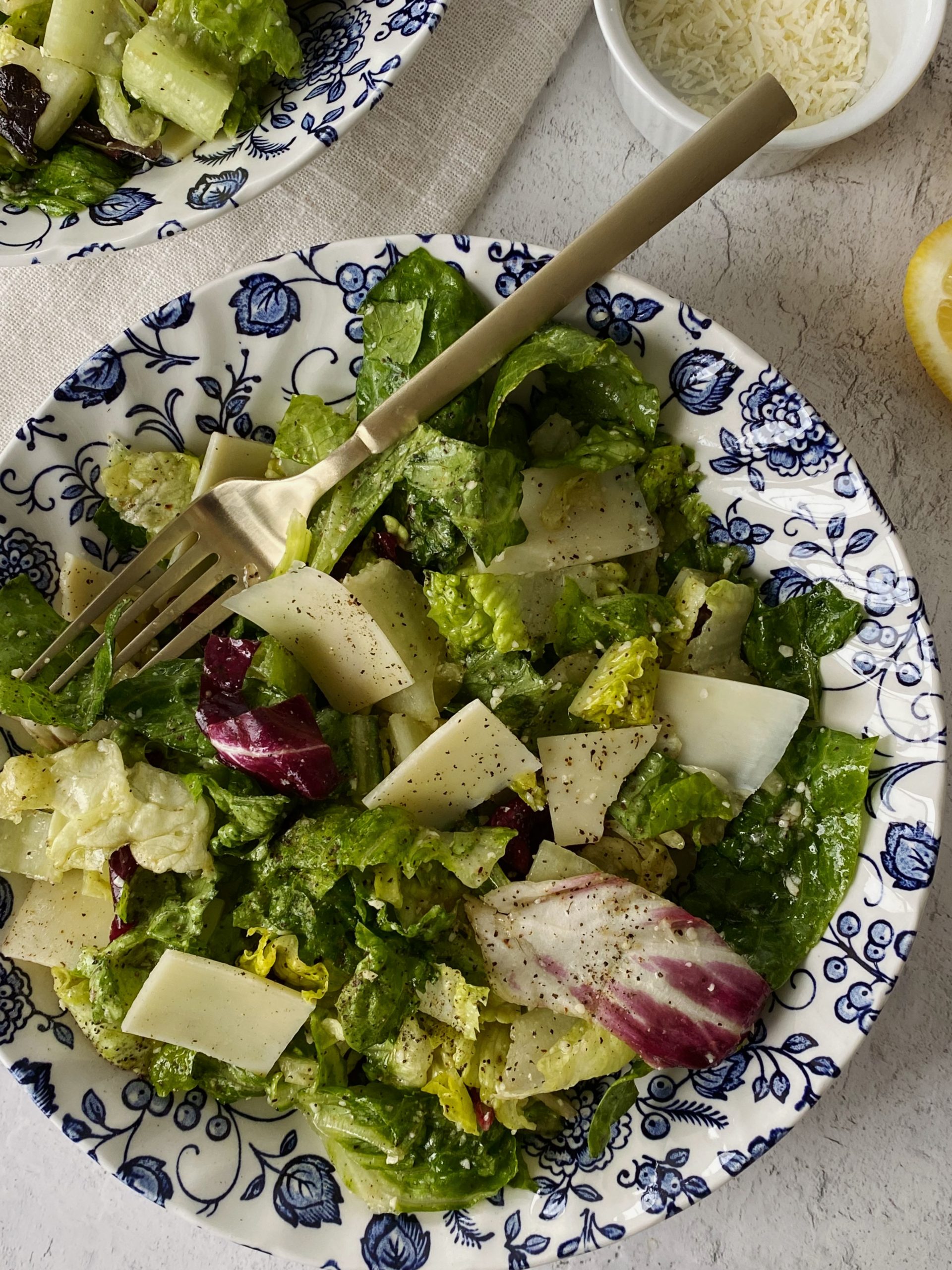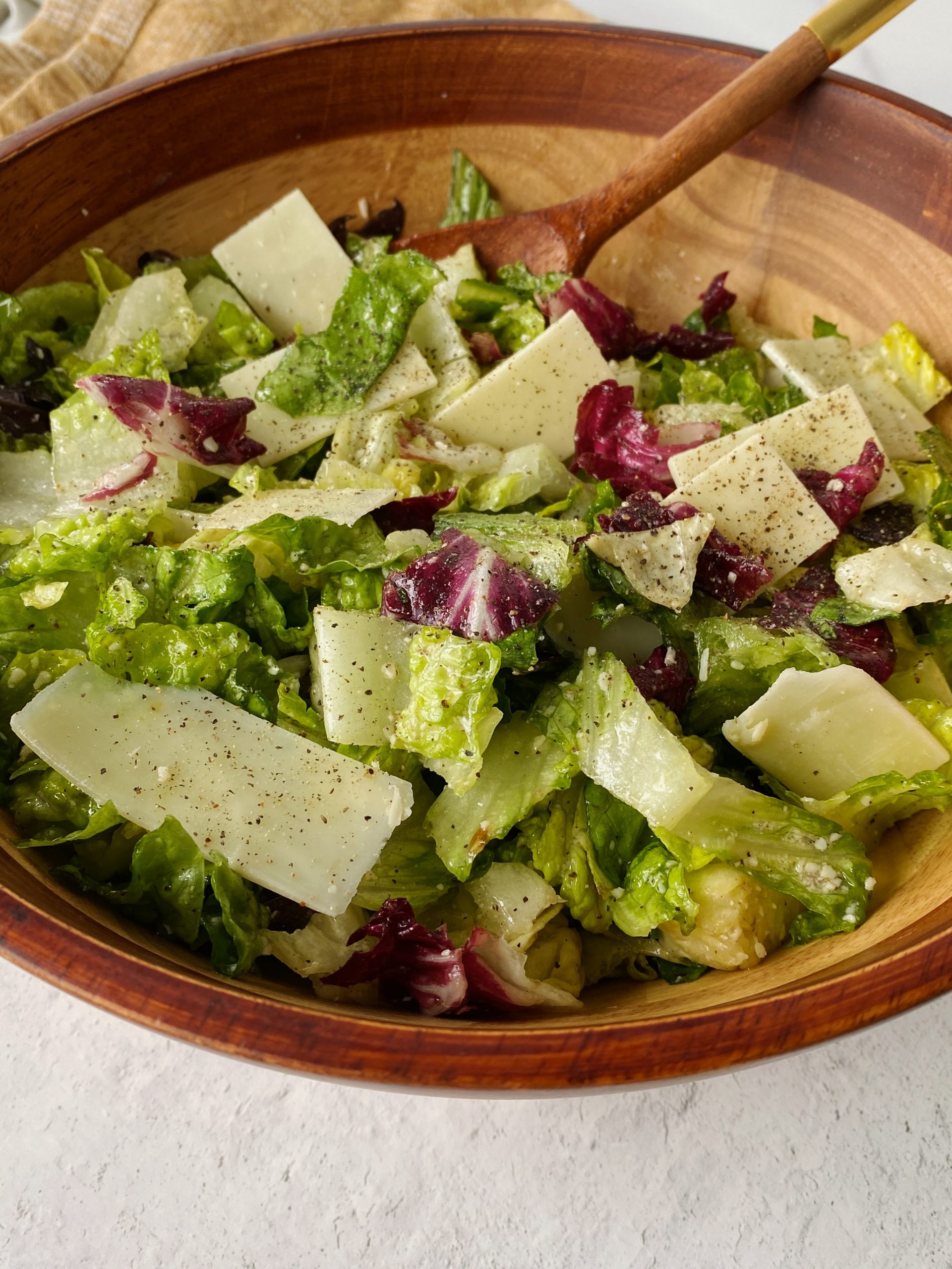 This lemony salad take 5 minutes to throw together, and is filled with freshly shaved parmesan. It’s flavorful, crunchy, and can be made with any greens of your choice.