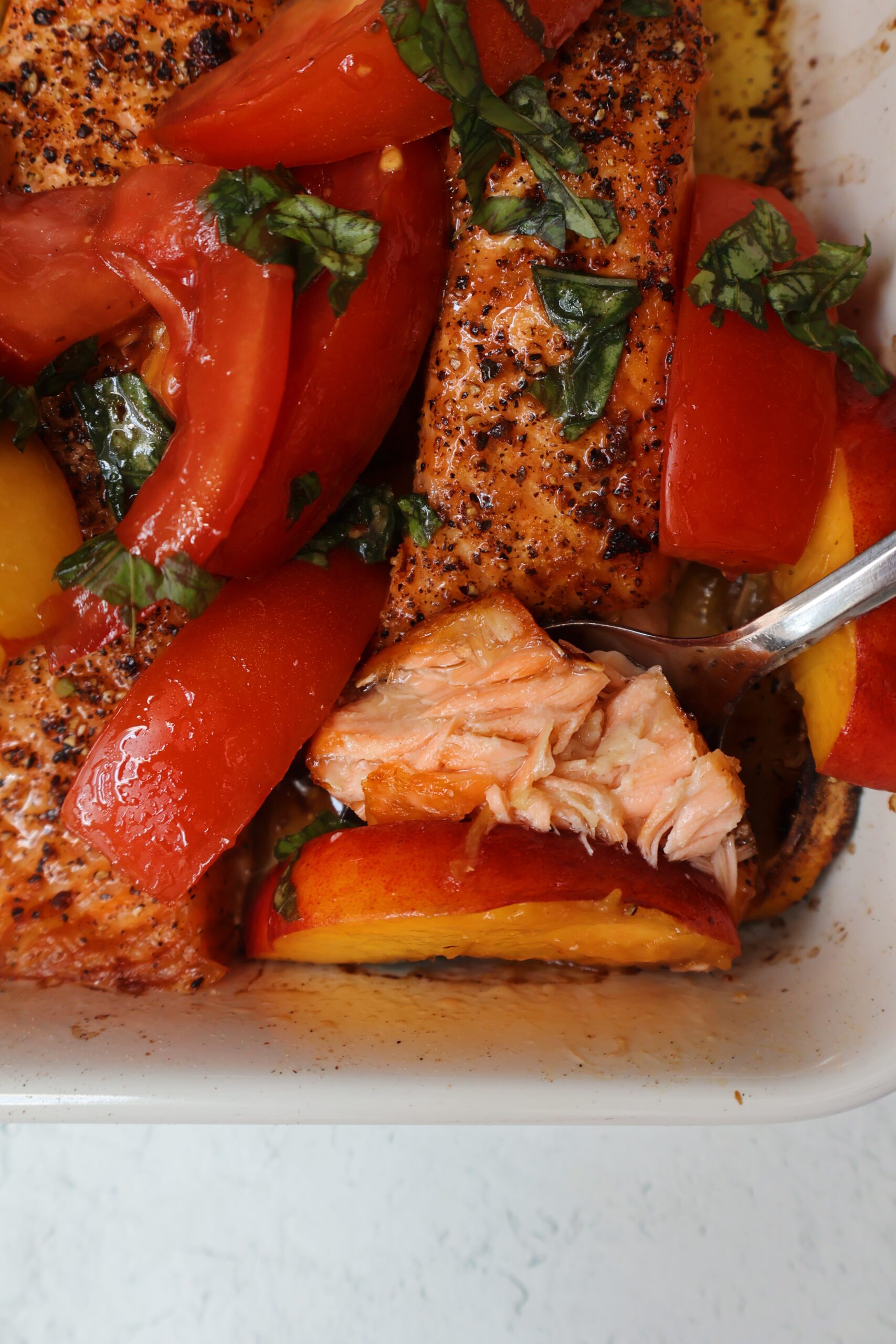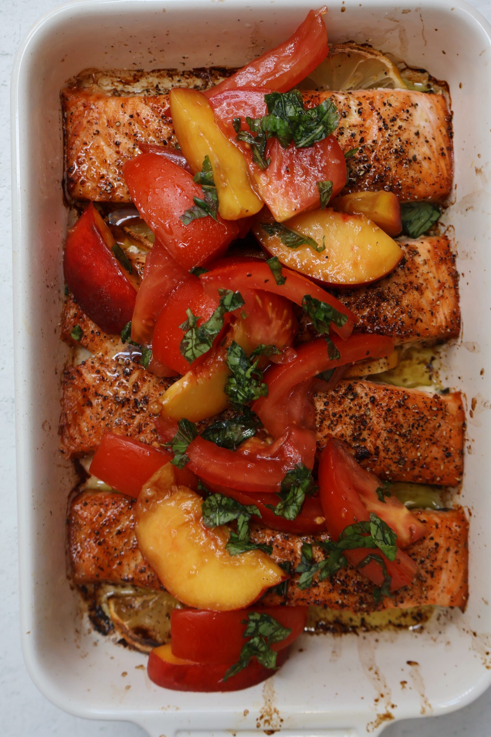 The salmon fillets are seasoned generously with cracked black pepper, salt, lemon juice, lemon zest and olive oil. They’re baked on the top rack then broiled at the end to get the ultimate crisp yet flakey texture, then topped with a delicious peach salad made with juicy yellow peaches, tomatoes, basil and balsamic.