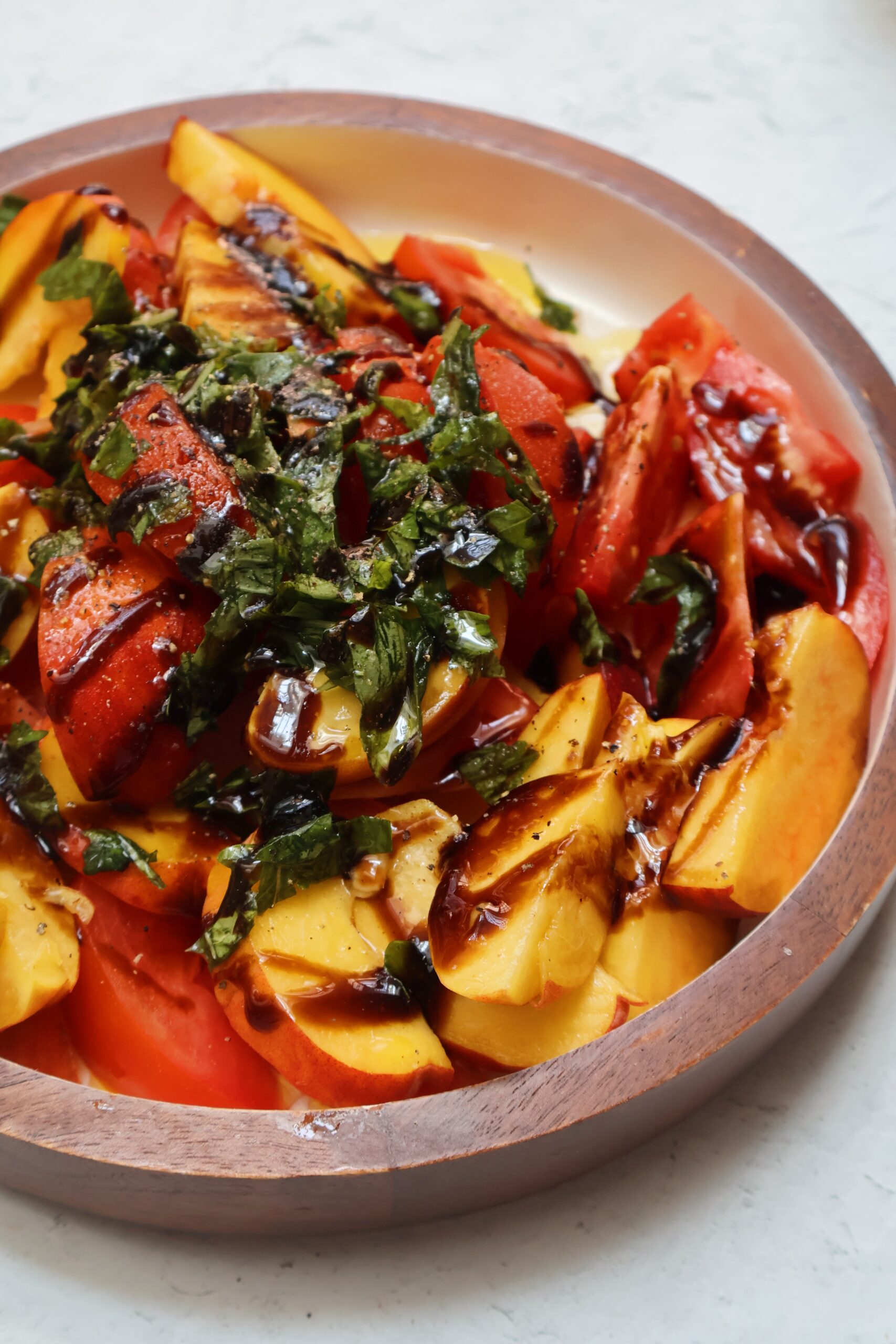 - Slice the peaches in half, remove the pit and slice into wedges. Add the peaches and tomatoes to a bowl with the chopped basil, balsamic, olive oil, lemon juice and salt.