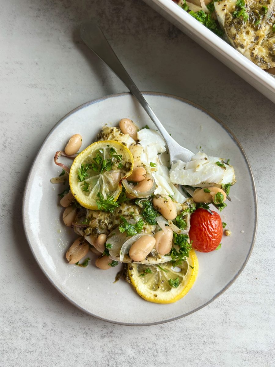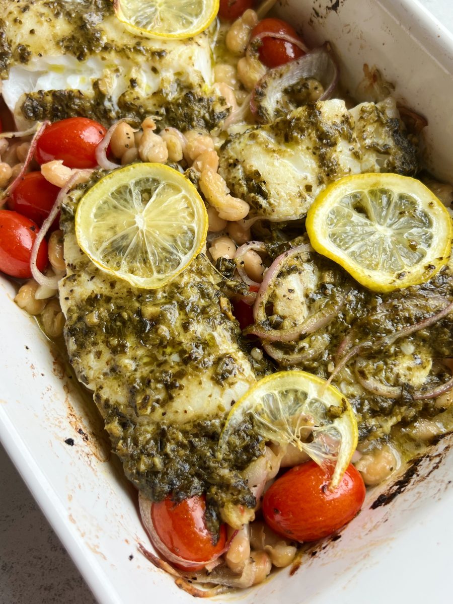 Cod is one of my top choices for this recipe because it flakes like butter and absorbs all of the delicious flavors of the dish. The canned beans add the perfect texture along with some fiber, and the added lemon juice to the pesto adds the perfect zest.