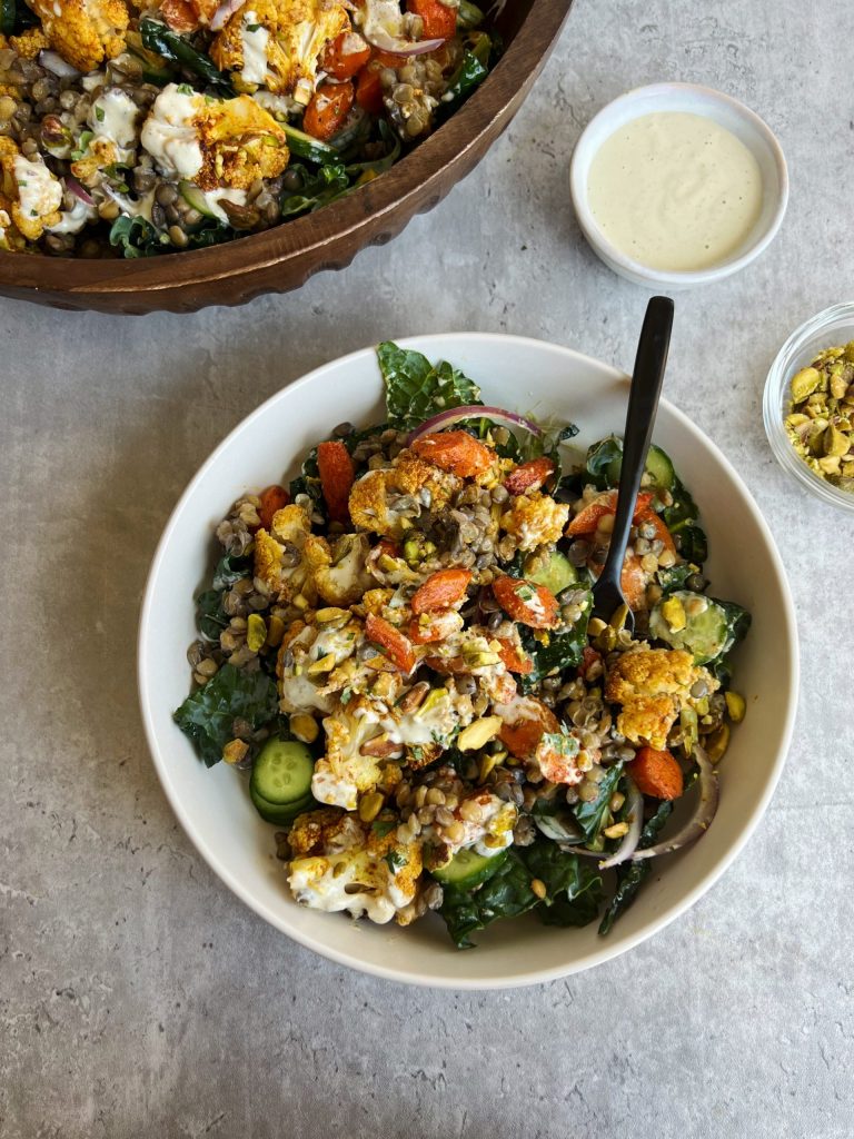 While the salad alone has some protein from the lentils, nuts, and cheese, I love serving it with an added protein during dinner time for a more satiating meal. Here are a few main proteins to serve with your lentil salad: