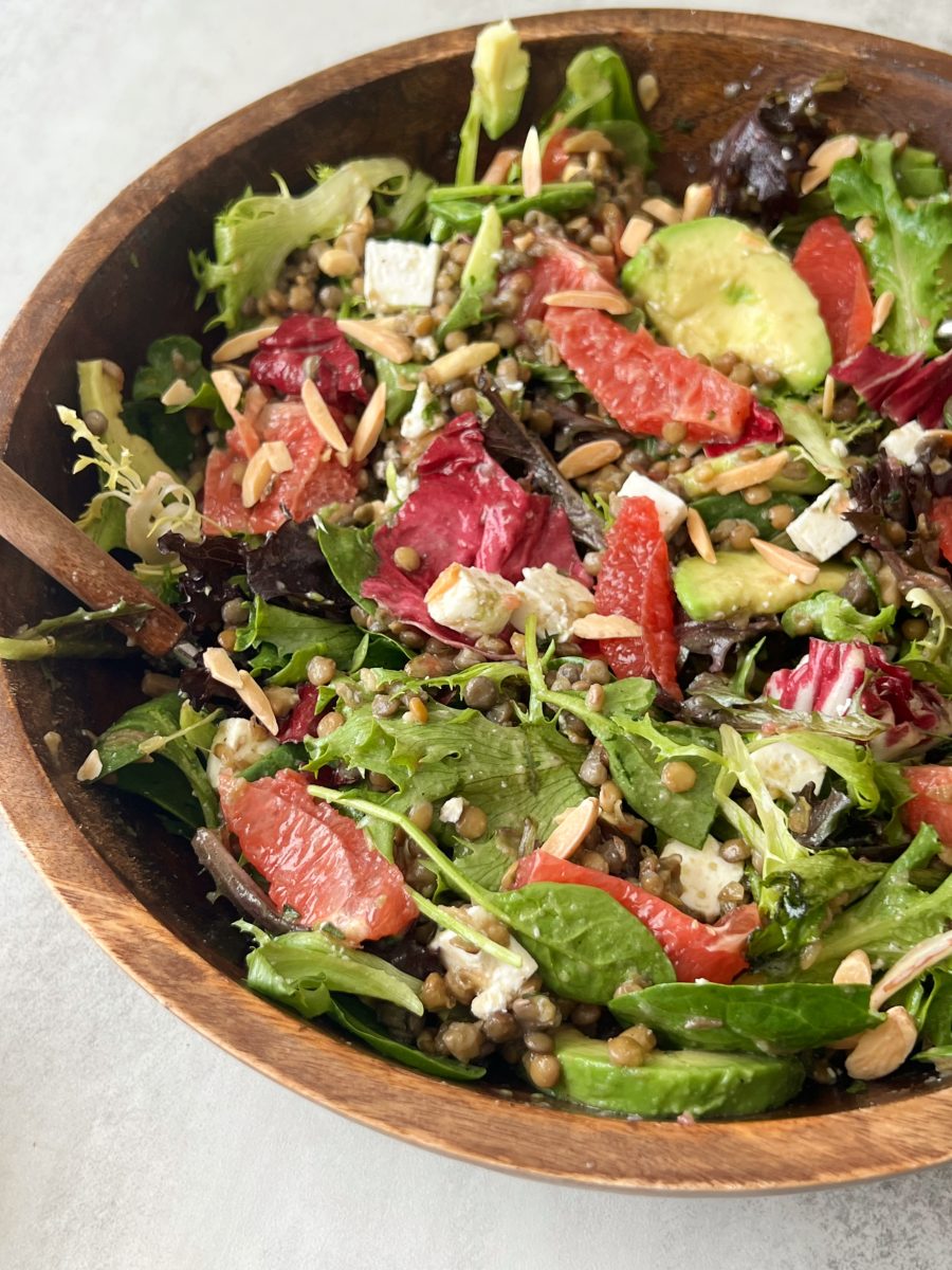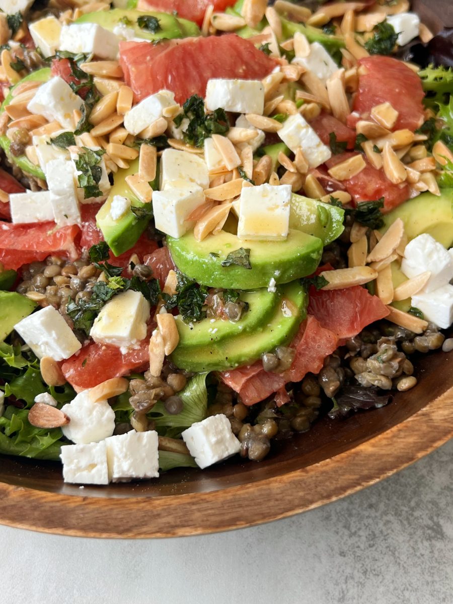 - Add the greens to a large salad bowl with the sliced grapefruit, lentils, avocado, feta, mint and almonds