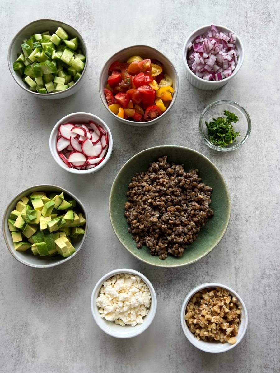 - Add the lentils to a bowl with the chopped veggies, feta, walnuts and parsley.