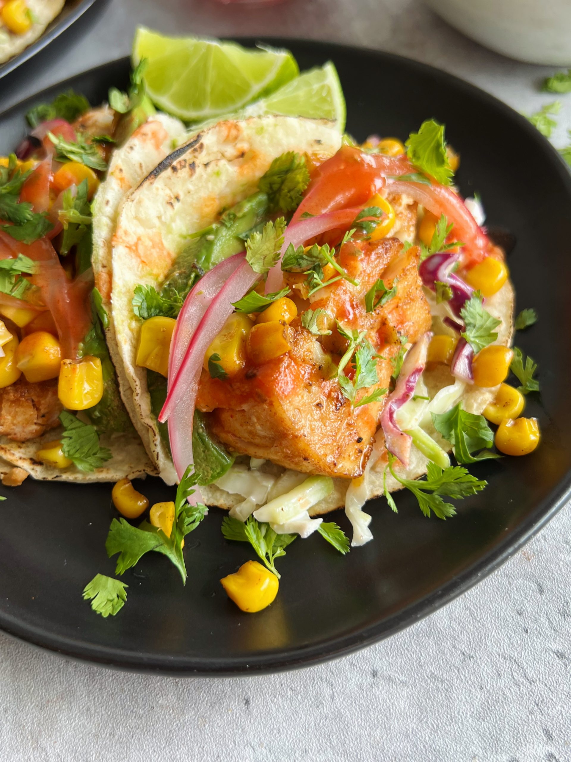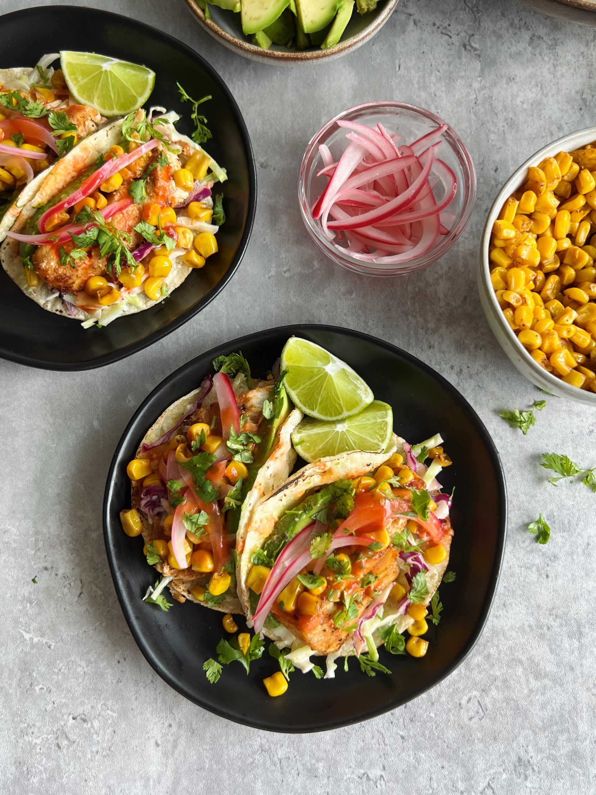 - Once your fillings are all prepared, layer them all on your favorite tortillas and add sliced avocado, pickled red onions, hot sauce and cilantro. I like to char my tortillas on the fire before assembling for best flavor.
