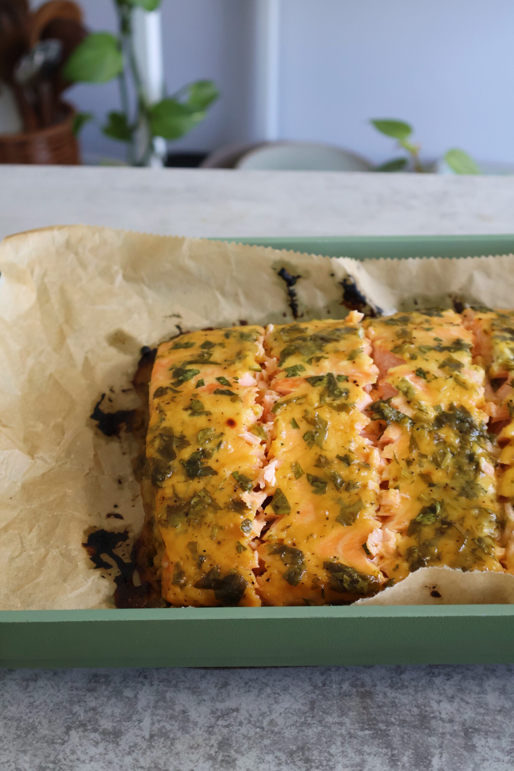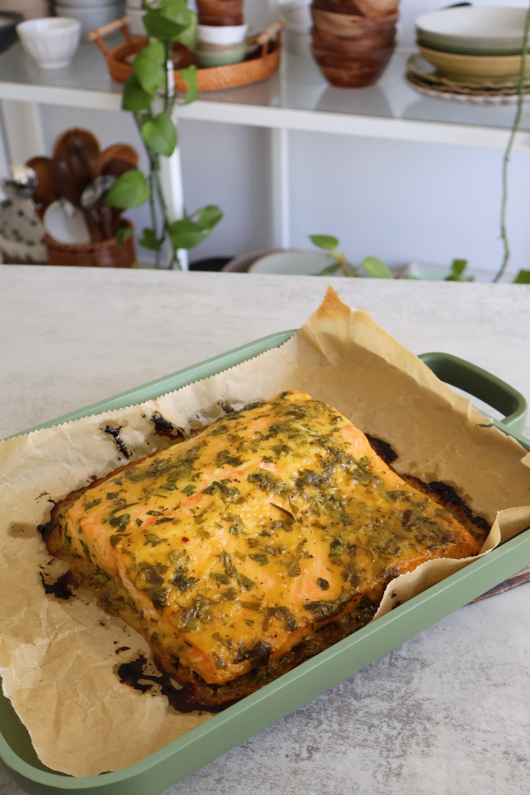 - Bake for about 15-18 minutes. Timing will depend on the thickness of the salmon. The salmon should flake easily with a fork when ready