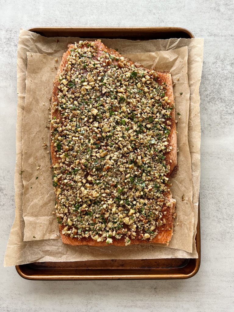 The salmon is generously seasoned with a homemade spice rub, then topped with a crunchy maple pecan and walnut crust. It gets baked until the nuts are golden brown and the salmon flakes with a fork.